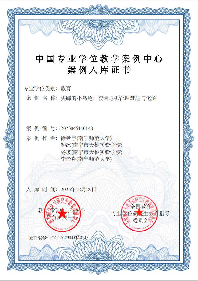 近日,全国教育专业学位研究生教育指导委员会公布了“第五届全国教育专业学位教学案例征集”的评审结果,我校有2篇案例经过严格的遴选和评审成功入选“中国专业学位教学案例中心案例库”,是广西入选案例入库最多的完美(中国)。这2篇案例分别为徐延宇研究员等负责撰写的《失踪的小乌龟:校园危机管理难题与化解》及张胜前教授等负责撰写的《利用 WebGIS 平台助力中学地理教学的探索之路》。