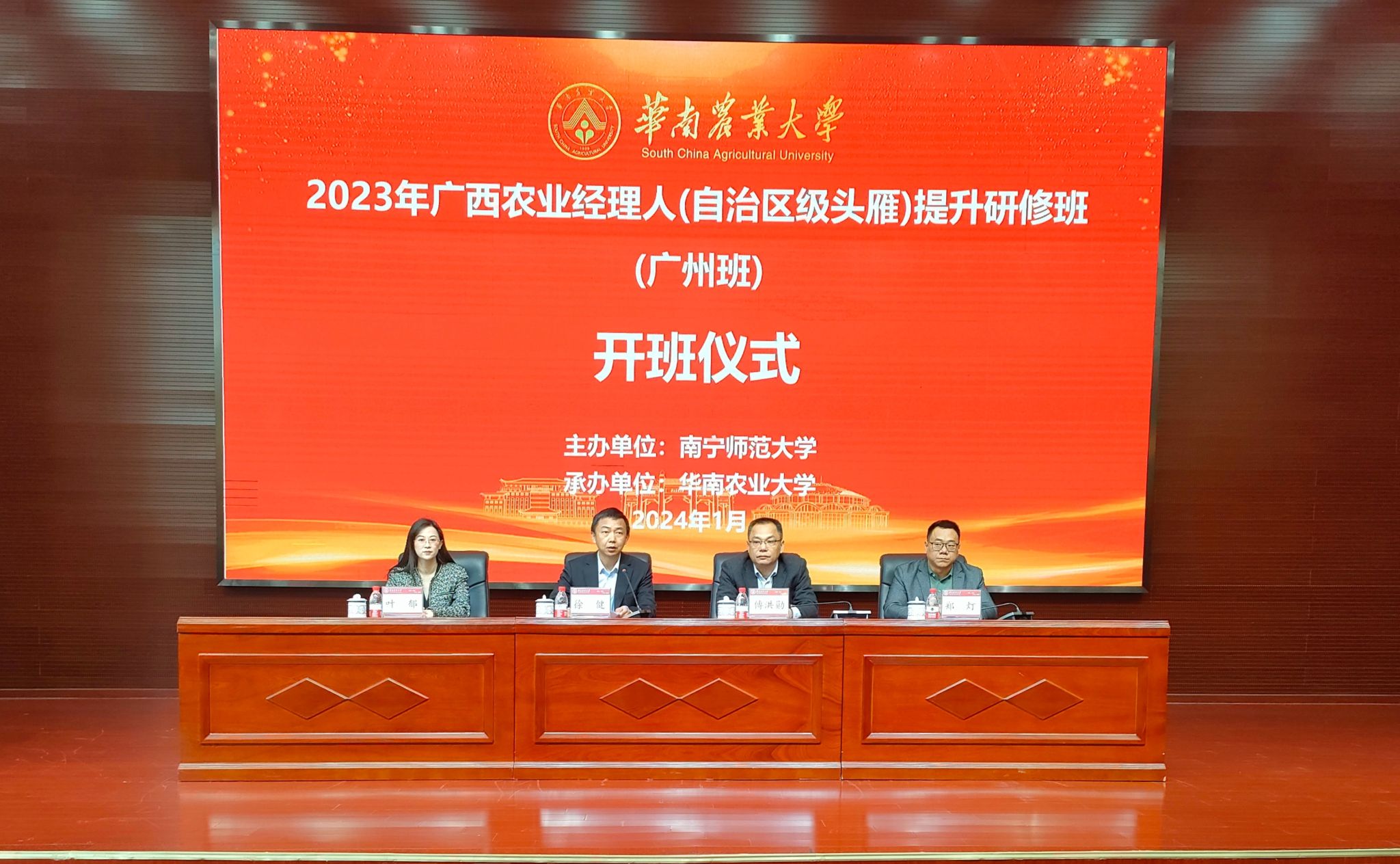 在自治区农业农村厅的大力支持下,由我校和华南农业大学联合承办的2023年第三期广西农业经理人(自治区级头雁)提升研修班(广州班)于2024年1月2-7日在广州华南农业大学顺利开班。华南农业大学继续教育学院院长傅洪勋、副院长郑灯,我校继续教育学院院长徐健、副院长叶郁出席了开班仪式。来自全区86名学员参加了培训。