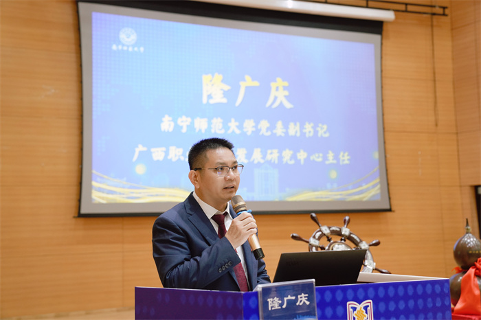 ▲南宁师范大学党委副书记、广西职业教育发展研究中心主任隆广庆致辞