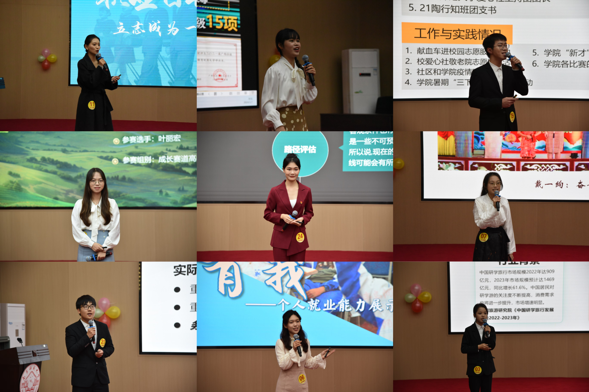 本次大赛设“成长赛道”与“就业赛道”,经学院初赛遴选推荐、校级复赛,遴选出40名选手进入校级决赛,其中成长赛道25名,就业赛道15名。比赛采取结构化形式,设有选手主题陈述、评委提问两个环节。各赛道比赛环节结束后,评委中智广西人力资源服务有限公司总经理韦婕老师,广西区人才服务中心特聘专家周长明老师对参赛选手表现作总结点评,并从回答评委提问、撰写生涯发展报告、读透比赛文件等方面对选手们提出了宝贵建议。
