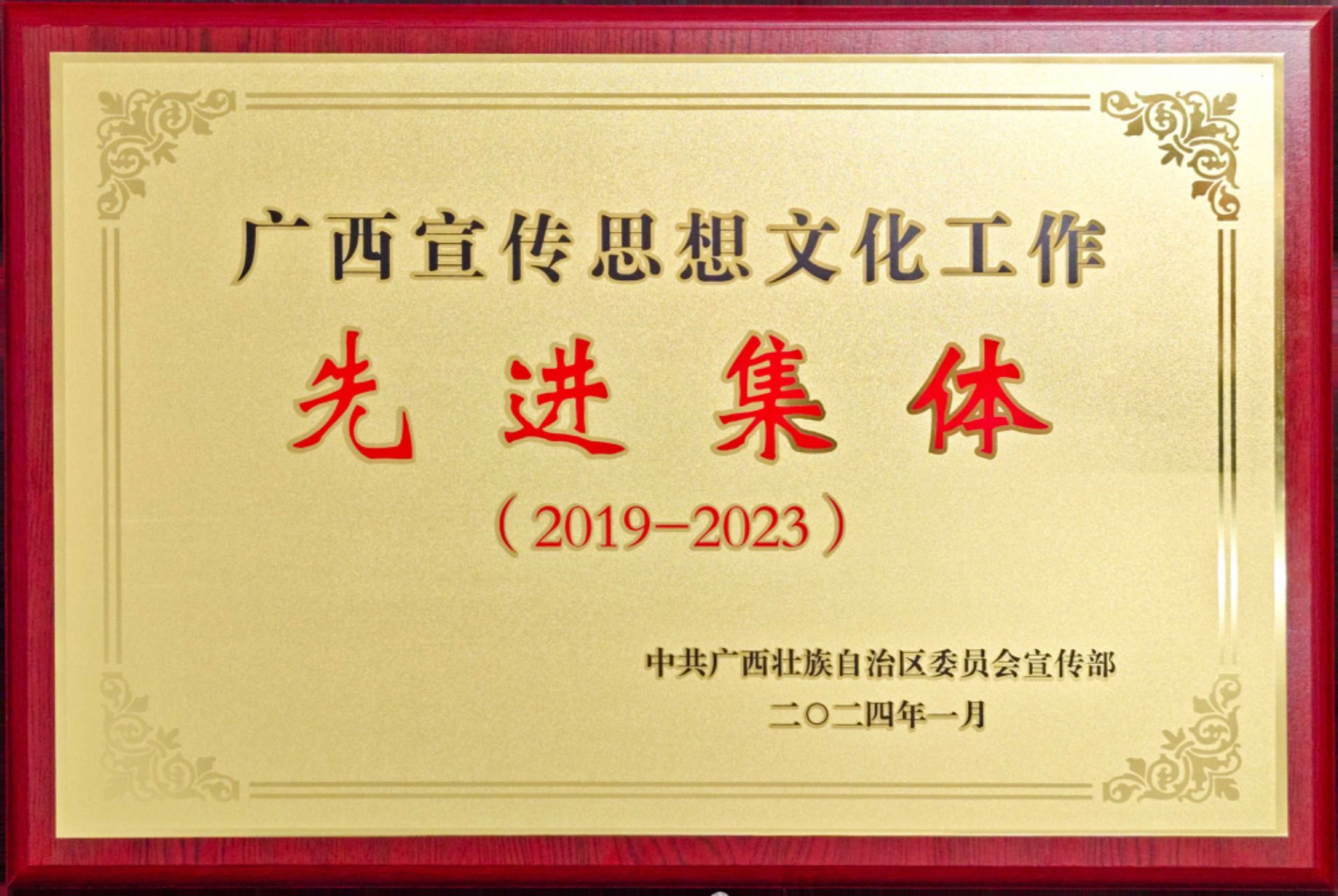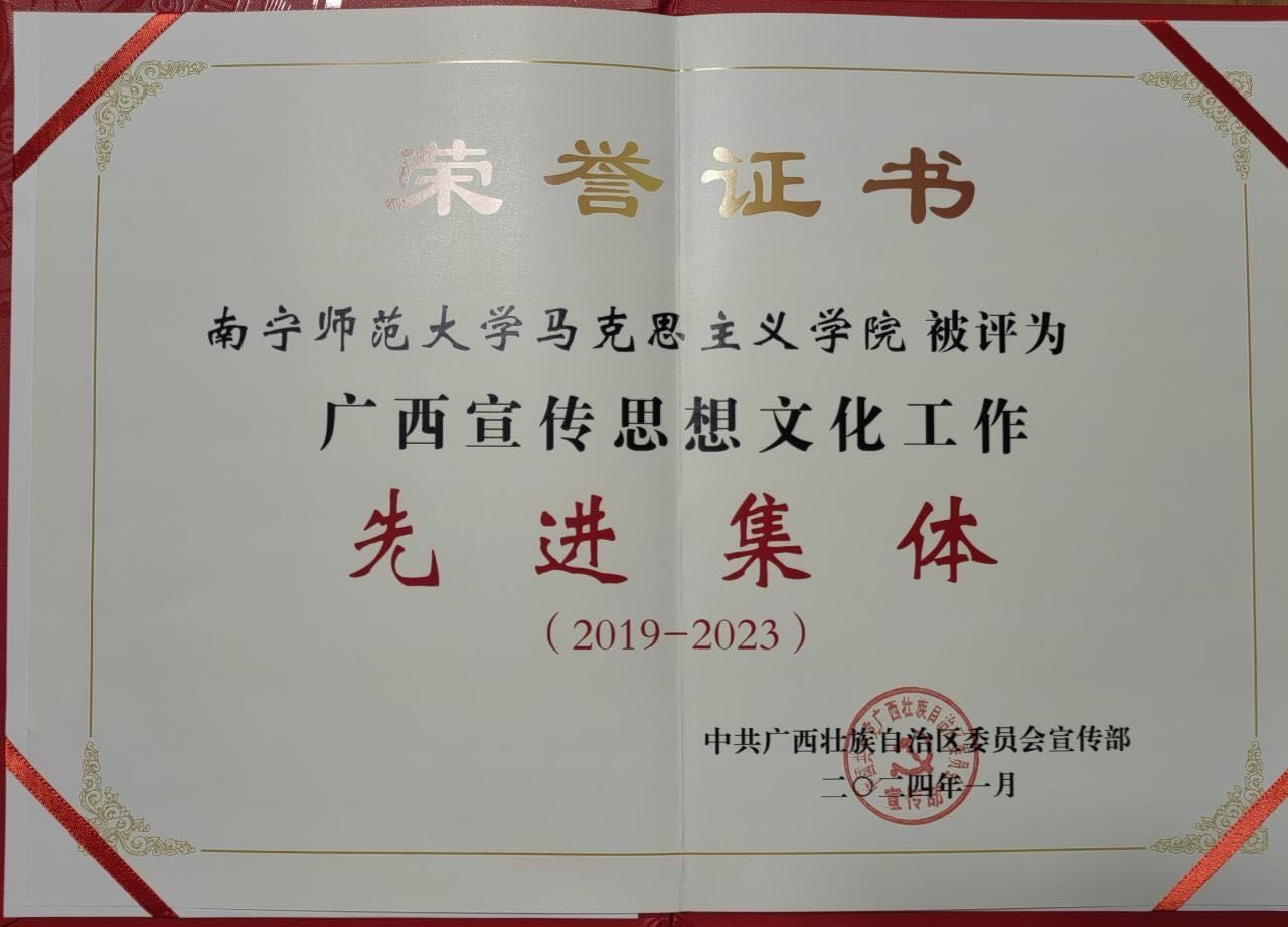 近日,为表彰先进、树立典型,弘扬正气、激励斗志,汇聚起建设新时代壮美广西的磅礴力量,广西壮族自治区党委宣传部决定,授予100个单位“广西宣传思想文化工作先进集体”称号,授予200名个人“广西宣传思想文化工作先进个人”称号。我校马克思主义学院获评“广西宣传思想文化工作先进集体(2019—2023)”。