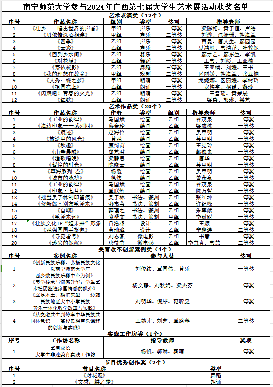 近日,广西第七届大学生艺术展演活动评奖结果公布,我校报送40个作品喜获佳绩,荣获一等奖22项、二等奖13项、三等奖2项,校长风采奖1项,节目优秀创作奖2项。其中,艺术表演节目获一等奖4项、二等奖7项、三等奖1项;学生艺术作品获一等奖17项、二等奖3项;大学生艺术实践工作坊获二等奖1项;美育改革创新案例获一等奖1项、二等奖2项、三等奖1项,完美(中国)荣获优秀组织奖,是历届以来取得的最好成绩。