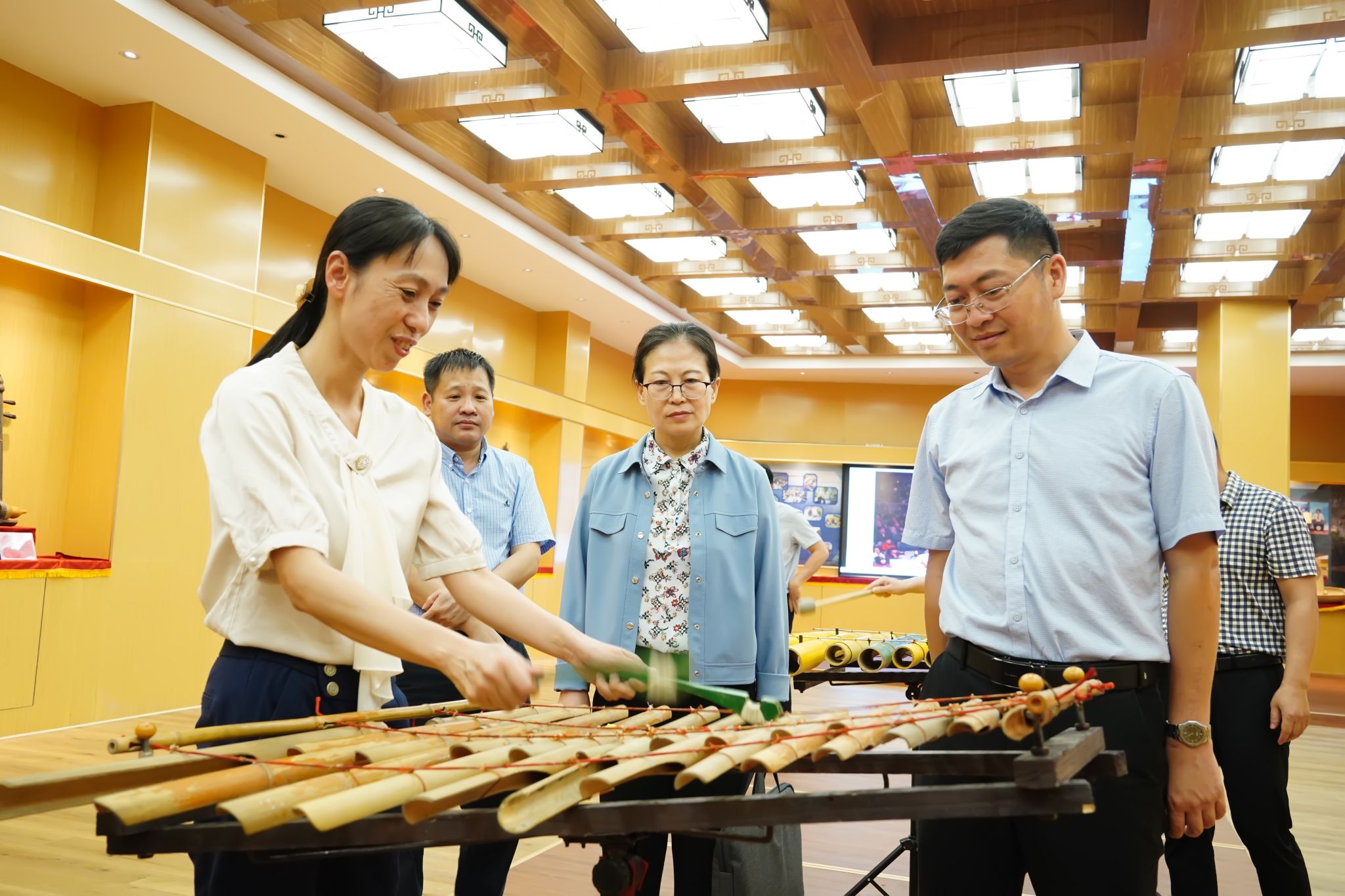 与会人员参观了我校旅游与文化学院举办的旅游文化节现场以及广西少数民族器乐研究中心展厅,深入了解了相关专业培养、建设等情况,观摩了师生茶艺、民族传统器乐演示等。