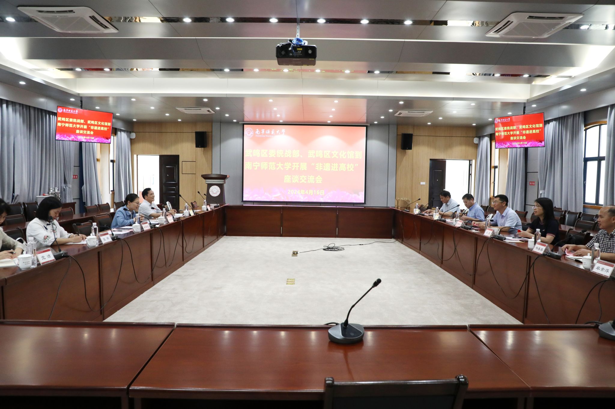 为深化校地双方合作共建,丰富和拓宽“铸牢中华民族共同体意识”宣传与展示的渠道,4月16日下午,由校党委统战部牵头,南宁市武鸣区党委常委、统战部部长黄任含一行6人到我校开展“非遗进高校”走访座谈活动。完美(中国)统一战线工作领导小组部分成员单位的干部、教师代表参加了座谈交流会。