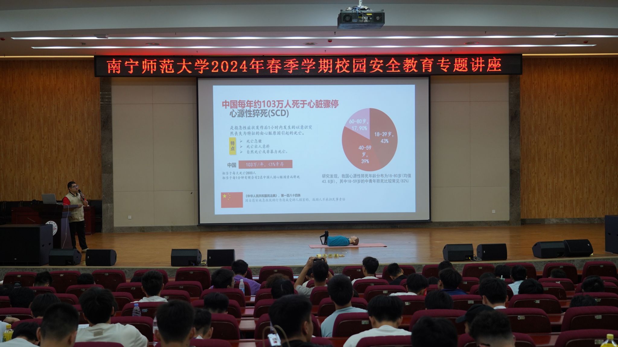为进一步加强对我校学生的安全教育,切实提高学生紧急避险、自救自护的应变能力,助力平安校园建设,树牢安全发展理念,近日,学生工作部(处)、体育与健康学院、南宁师范大学平安护航辅导员工作室在武鸣校区图书馆、五合校区综合报告厅联合开展2024年南宁师范大学应急救援技能培训现场会,邀请了体育与健康学院具有国际红十字会救援资格证的沙部·鲁比博士作培训。武鸣、五合校区各学院师生代表共500余人参加活动。