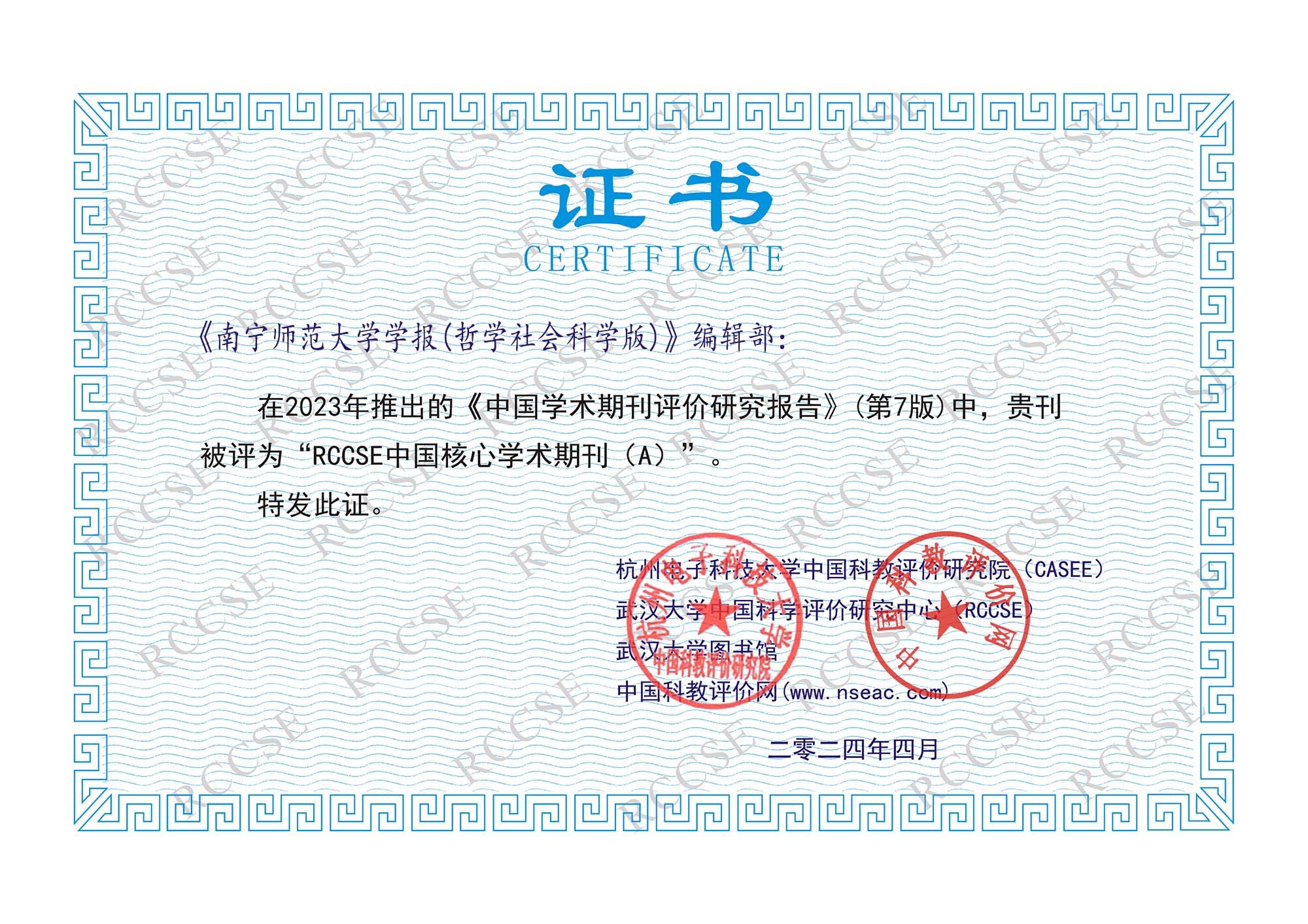 《南宁师范大学学报(哲学社会科学版)》在2023年度《中国学术期刊评价研究报告》(第7版)中,再次被评为“RCCSE中国核心学术期刊(A)”,在参评的6469种中文学术期刊中位列5%-20%,在424种人文科学综合期刊中排名68位,较之2020年度第6版的74位排名有所提升。《南宁师范大学学报(自然科学版)》在2023年度《中国学术期刊评价研究报告》(第7版)中,再次被评为“RCCSE中国准核心学术期刊(B+)”,在参评的6469种中文学术期刊中位列30%-60%,在175种自然科学综合期刊中排名142位。