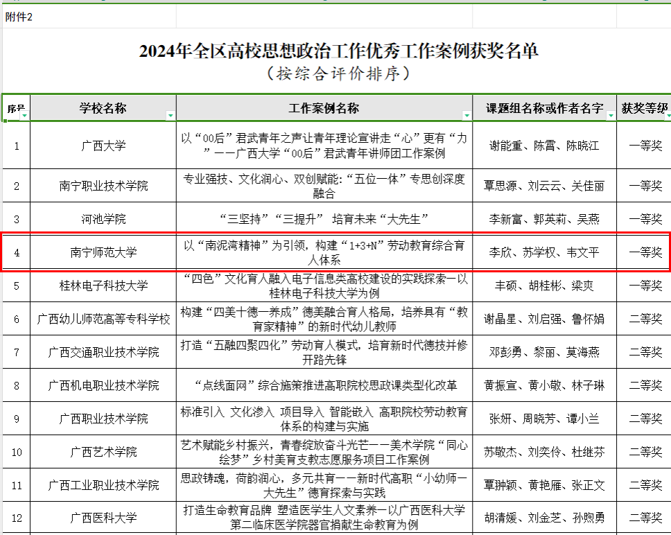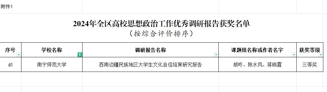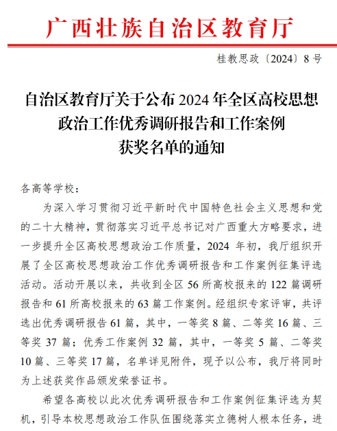 据了解,2024年初,自治区教育厅组织开展了全区高校思想政治工作优秀调研报告和工作案例征集评选,共收到全区56所高校报送的122篇调研报告和61所高校报送的63篇工作案例。经组织专家评审,共评选出优秀调研报告61篇,其中,一等奖8篇、二等奖16篇、三等奖37篇;优秀工作案例32篇,其中,一等奖5篇、二等奖10篇、三等奖17篇。