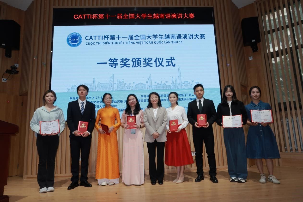 4月27日-28日,CATTI杯第十一届全国越南语演讲大赛暨越南语教学研讨会在北京外国语大学举行,我校国际教育学院越南语专业罗媛、覃瑞莲两名大三同学由越南语专业陆雪梅老师指导并带队参赛。在激烈的角逐中,我校参赛学生展现出良好的越南语专业素养和沉着冷静的应赛能力。在定题演讲环节,罗媛同学以《我与祖国共成长》作为演讲主题,覃瑞莲同学以《零和博弈》作为演讲主题,均得到了评委的一致好评,并且在即兴演讲环节发挥优异,最终罗媛同学获得了大三年级组一等奖,覃瑞莲同学获得了二等奖。