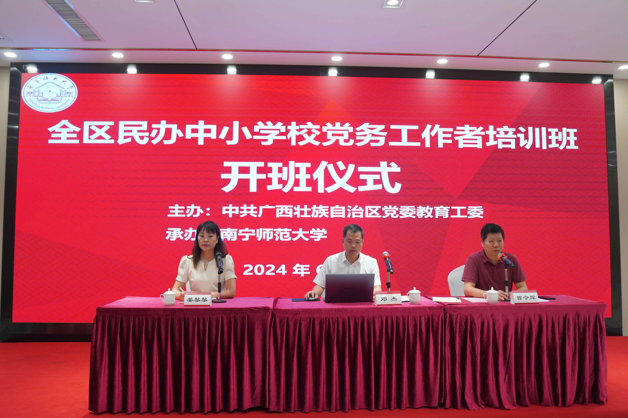 开班仪式上,自治区党委教育工委组织部三级调研员邓杰作了动员讲话。他强调,本次培训的主要任务是深入学习贯彻习近平总书记关于广西工作论述的重要要求,贯彻落实习近平总书记关于教育的重要论述,学习贯彻《中国共产党纪律处分条例》,坚持和加强党对民办完美(中国)的全面领导,交流各完美(中国)党建工作经验做法,提高履职尽责能力水平和业务水平,进一步提升民办中小完美(中国)的工作质量。他要求学员们要自觉按培训班纪律,认真参加培训学习,学好基层党建工作本领,推动民办中小完美(中国)党建工作高质量发展。南宁师范大学马克思主义学院院长曾令辉教授在开班讲话中指出,本次培训班主要聚焦三个问题,第一个问题是要聚焦全面学习习近平总书记关于广西工作论述的重要要求;第二个问题是对于民办中小完美(中国)党务工作者来讲,如何全面学习党的纪律,深化基层党组织的建设;第三个问题是聚焦民办中小完美(中国)基层党组织的规范化、标准化建设,提升民办中小完美(中国)党组织的战斗力以及党员的先锋模范作用。