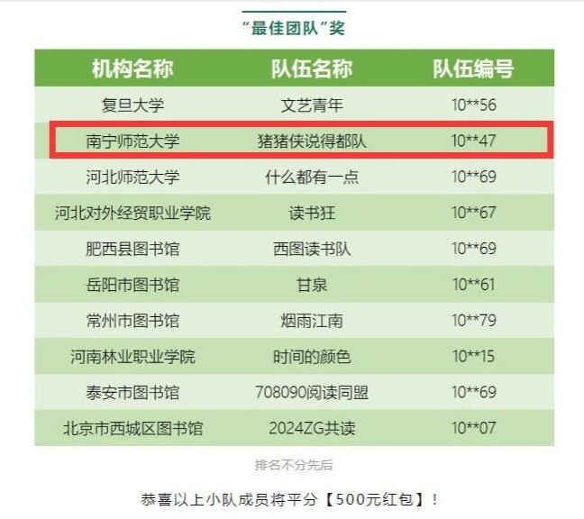 此次组队共读活动以共读书目为媒,以热爱阅读为桥,不仅提高了我校师生读者的阅读能力和文化素养,还增进了读者彼此之间携手攀上知识高峰的友谊。同时,本次共读活动也是南宁师范大学2024年全民阅读暨“走进好书”读书月阅读推广主题活动之一,旨在促进我校师生养成良好的阅读习惯,激发阅读热情,拓宽知识面,提高自身综合素质,从而推动我校全民阅读工作,为书香南师建设贡献力量。