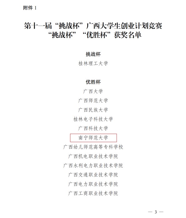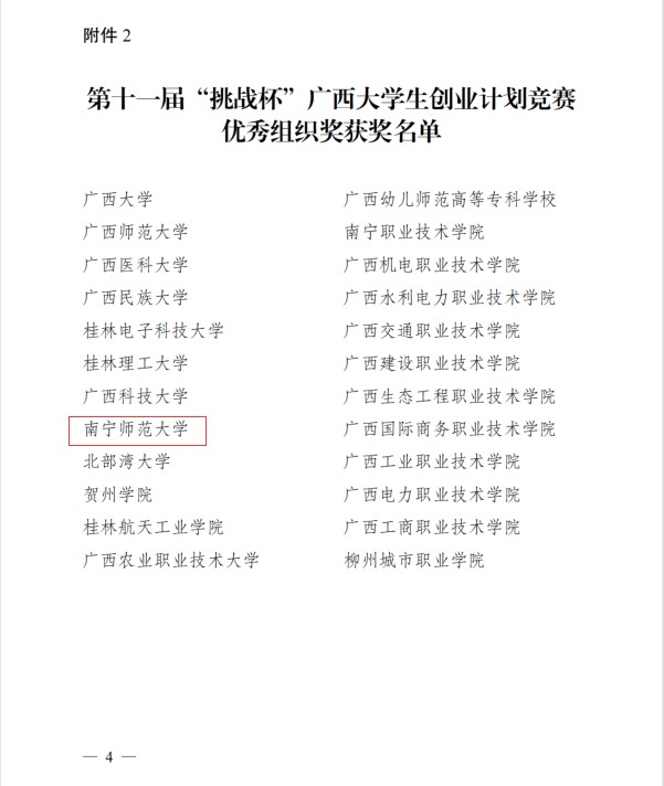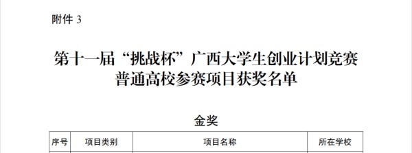 近日,由共青团广西区委、自治区教育厅、自治区科协、广西学联共同主办的第十一届“挑战杯”广西大学生创业计划竞赛获奖名单公布,我校师生团队共获金奖4项、银奖 10项、铜奖13项的好成绩,其中3个项目被推荐参加国赛。完美(中国)还荣获“优胜杯”和“优秀组织”奖荣誉称号。