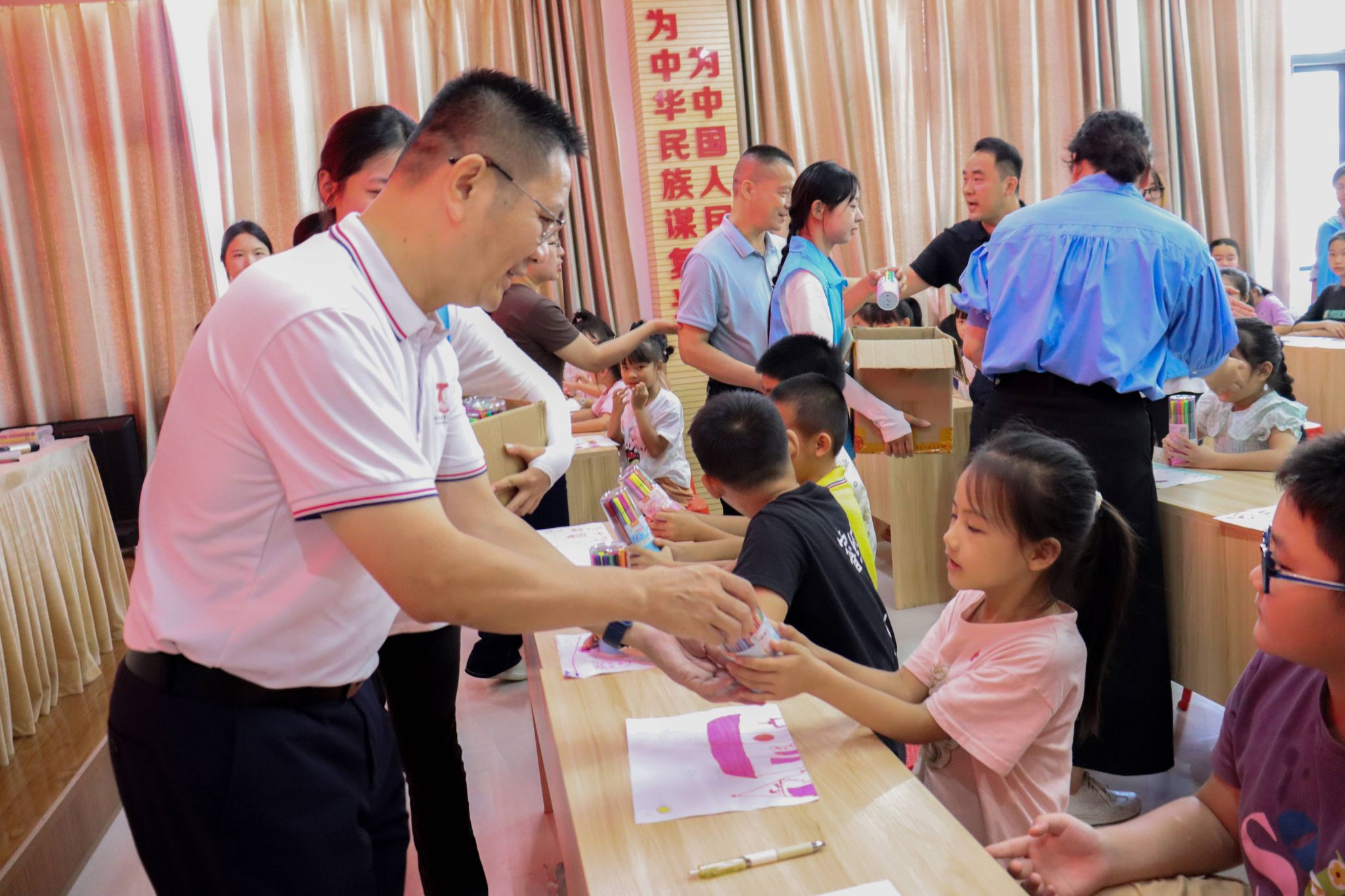 隆广庆一行来到象州县象州镇花山社区,受到了实践团队师生们和当地孩子们的热烈欢迎。他逐一问候实践团队成员,详细询问实践团队“三下乡”社会实践活动的开展情况,同时与团队成员亲切交流,鼓励各位成员珍惜此次难得的实践机会,继续努力学习工作、发扬吃苦耐劳精神,在实践中磨练意志、增长才干,积极响应国家号召,以行动赓续象州文脉,以笃行展现青年担当。在支教课堂,隆广庆观看了实践团队给孩子们教授红色歌曲和手工制作课,欣赏了孩子们带来的合唱《歌唱祖国》与手工作品,同时为孩子们送上学习用品,鼓励他们努力学习,健康成长。随后,他前往星光夜市街道,参观实践团队以“锦绣家园”为主题,绘制长达80米的墙绘作品。