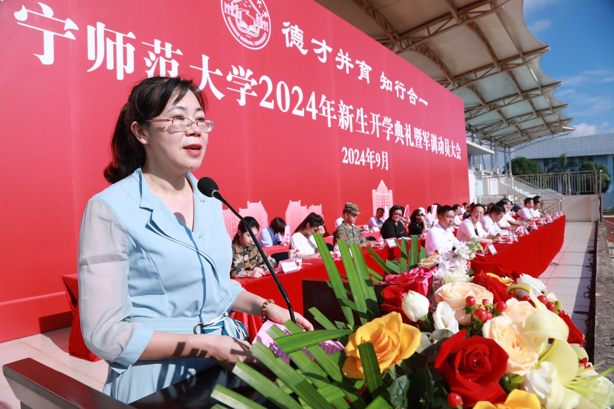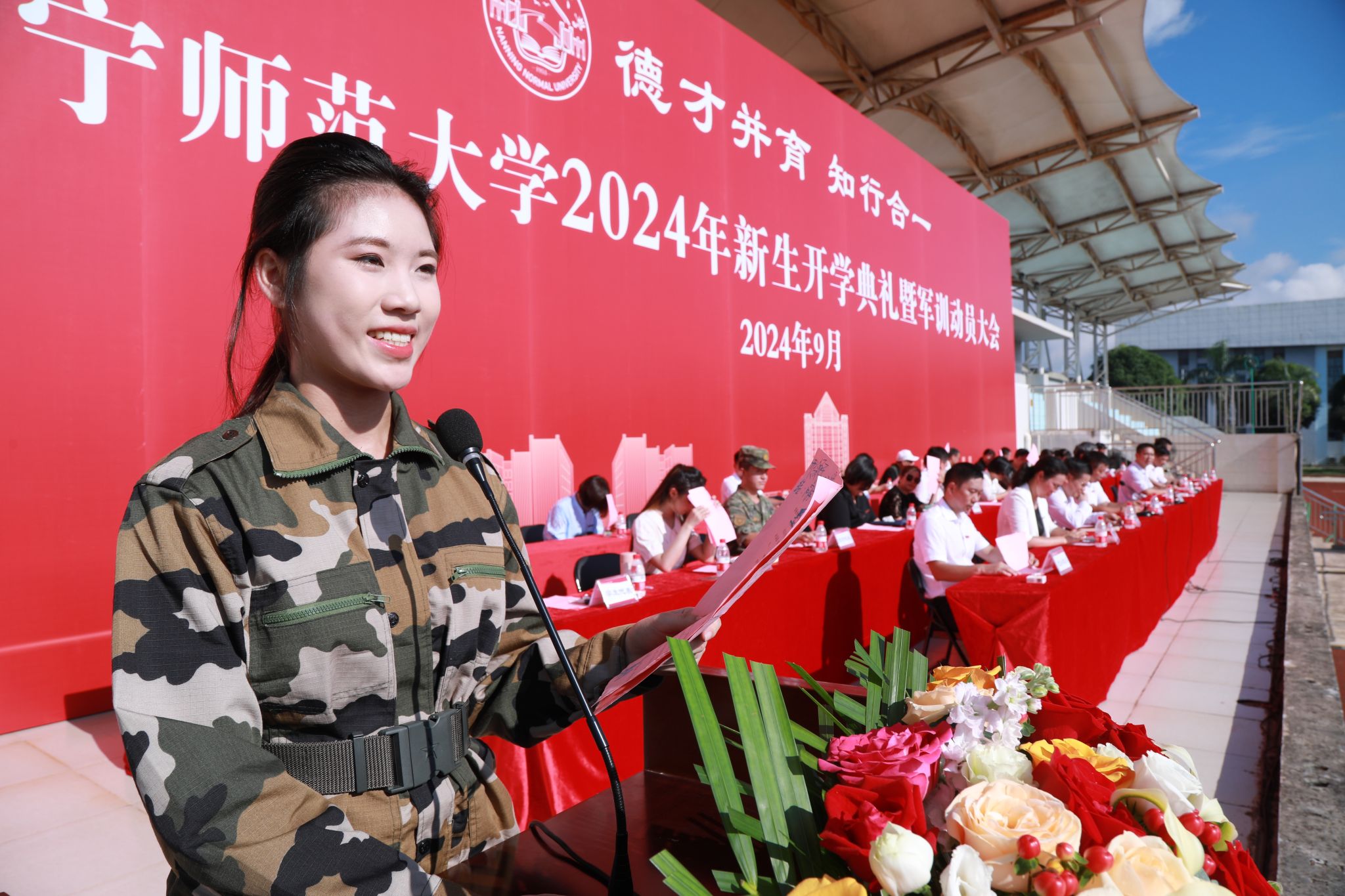 “同学们,当你们迈入南宁师大校门的那一刻起,历史的接力棒就传递到你们手中。南宁师大将与最年轻的南师人同向同行、荣辱与共。期待你们用汗水见证成长、用初心映照未来、用责任守护荣光,书写属于自己热辣滚烫的青春!”两位校领导的良言寄语,如同一份厚重的新学期“见面礼”,感染启迪了新同学,现场掌声不断。