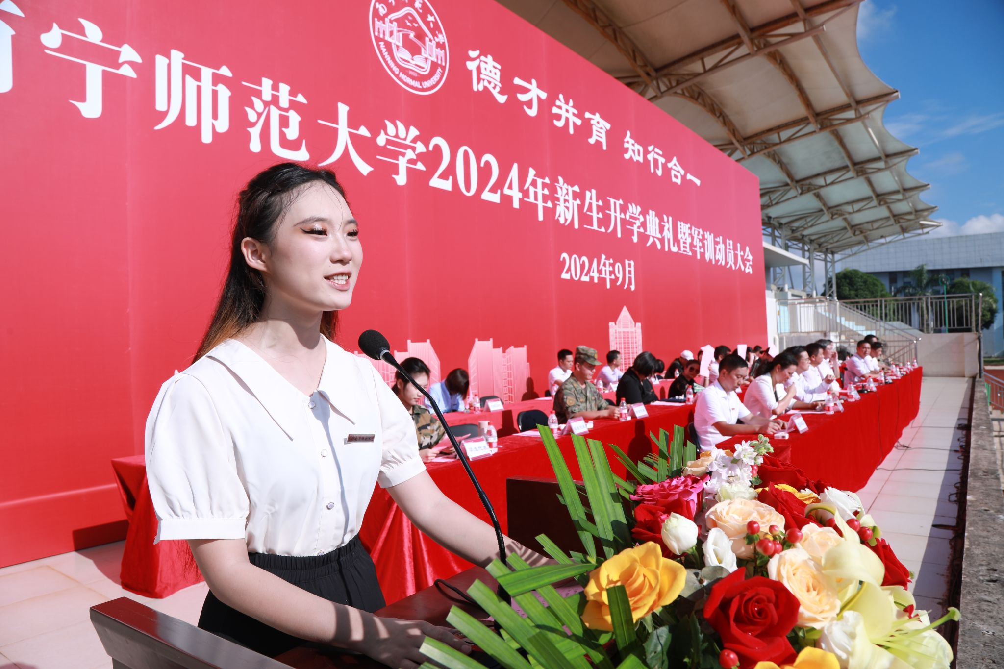 高年级学生代表王昊、虢娇分享了在大学学习生活的感悟,鼓舞新同学要心系国家事、肩扛国家责,与时代共奋进、与祖国共命运,在南宁师范大学的舞台上书写自己的精彩。