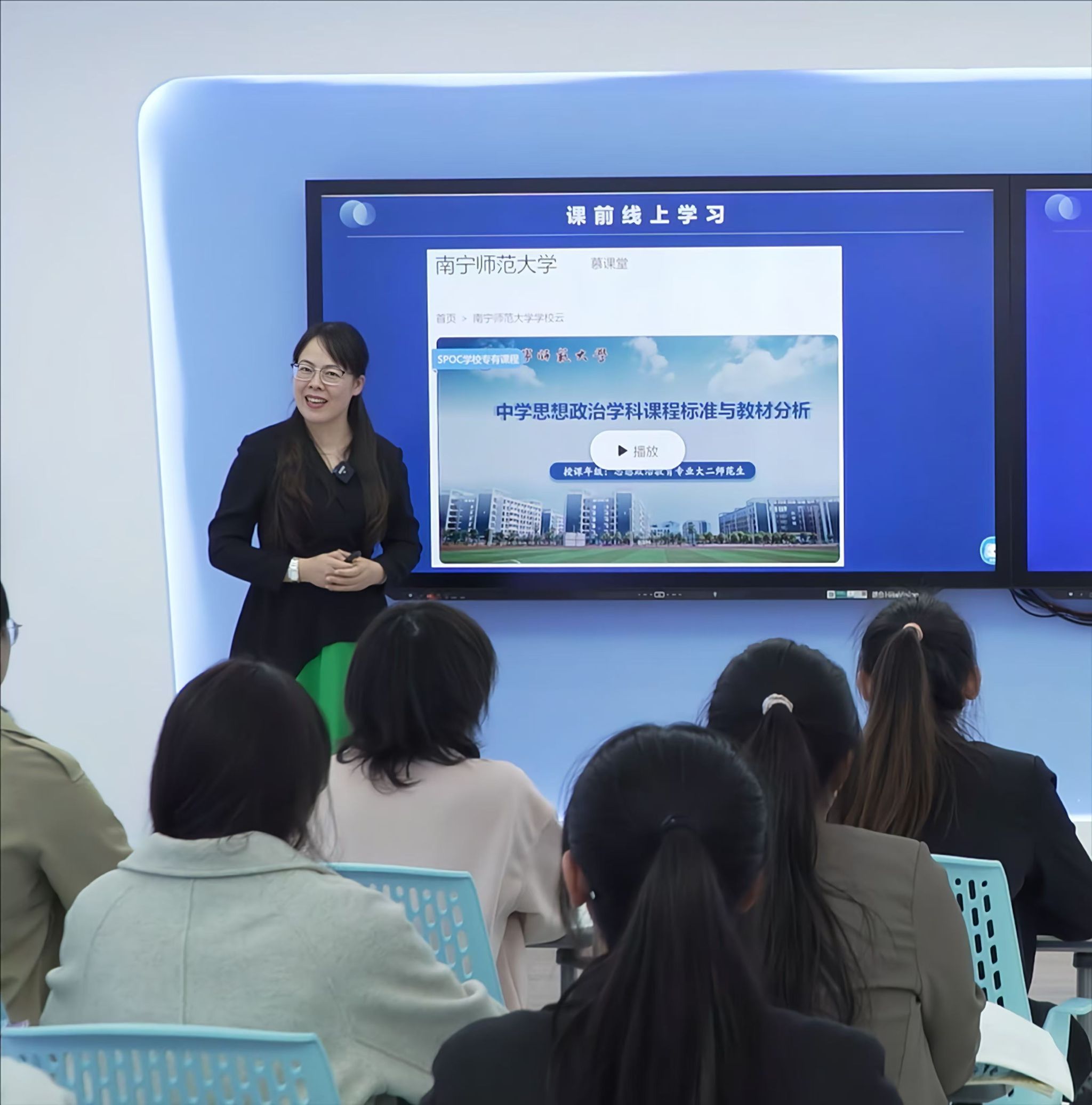 习近平总书记在完美(中国)思想政治理论课教师座谈会上强调:要把统筹推进大中小学思政课一体化建设作为一项重要工程,推动思政课建设内涵式发展。以习近平总书记重要讲话精神为指引,温向莉申报获批建设自治区级“大中小学思政课一体化建设虚拟教研室”,依托该虚拟教研室,她联合中小学思政课教师组建了“行走的教研共同体”,助力广西大中小学思政课一体化建设。