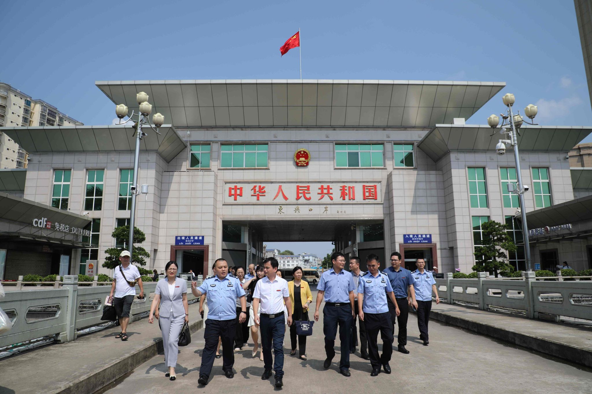 在边检站副站长李敏等工作人员的陪同下,肖琦副校长一行参观考察了东兴口岸边检大厅、中越友谊大桥等,了解口岸过境人员的往来情况。