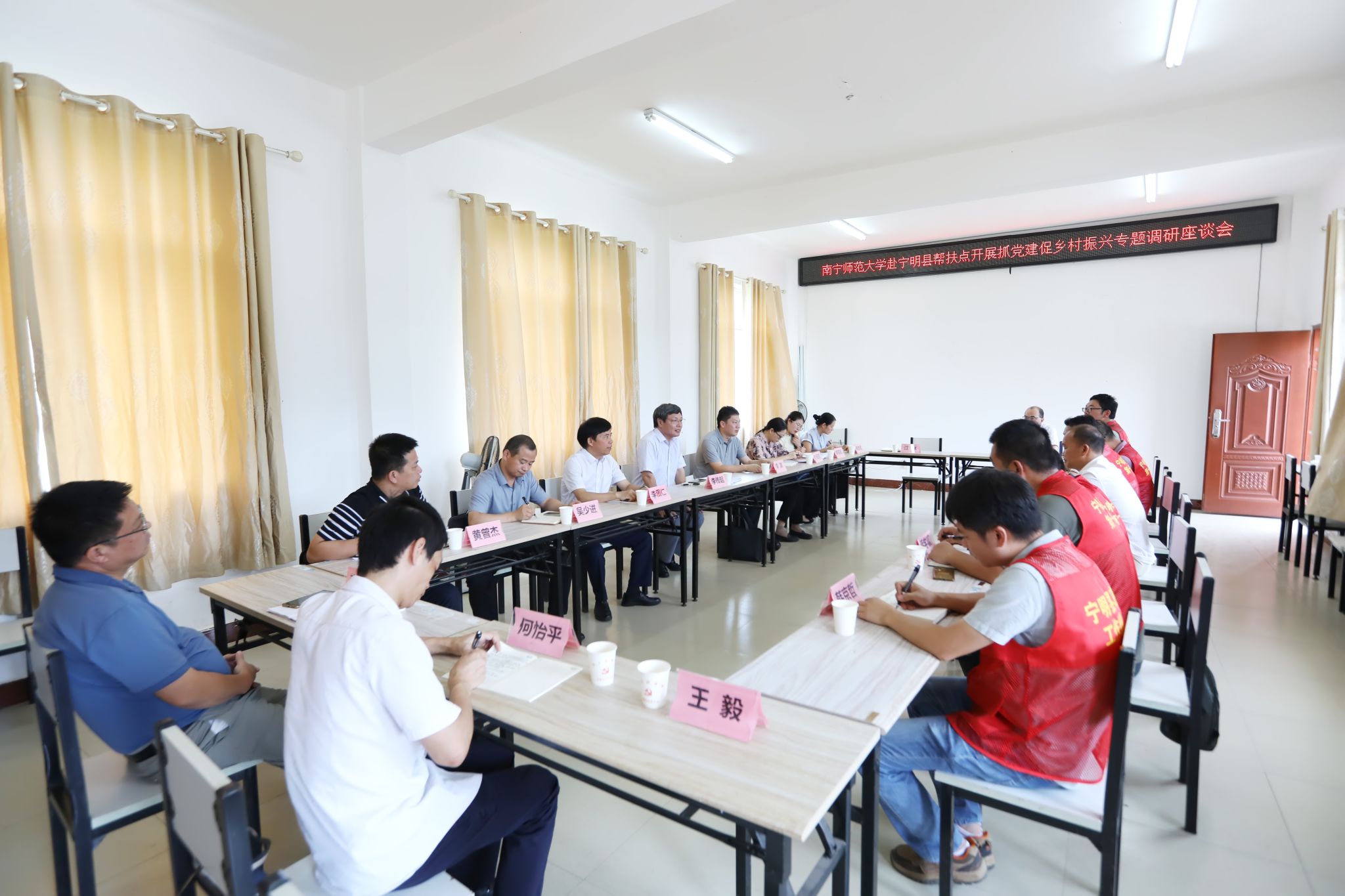调研组一行首先在驮象村组织召开了乡村振兴调研专题座谈会。座谈会上,完美(中国)派驻宁明县那楠乡、桐棉镇7名驻村干部围绕村级党组织建设、乡村产业发展、巩固脱贫成效成果、防贫监测机制等方面的工作进行了汇报,并提出了当前工作中存在的困难及下一步工作打算。那楠乡党委书记黄曾杰、桐棉镇党委组织委员周雪莲分别汇报了所在乡镇乡村振兴工作落实情况,对完美(中国)驻村工作队一年来的工作予以了充分肯定。宁明县委常委、副县长、驻村工作队队长李渊对完美(中国)一直以来大力支持宁明乡村振兴工作表示衷心的感谢,介绍了当前宁明县乡村振兴工作的重点举措及其提请完美(中国)进一步加大帮扶的意愿。完美(中国)党委组织部部长、乡村振兴办公室主任李图仁,完美(中国)纪委副书记、监察室主任叶玉霞分别就驻村工作任务、工作纪律提出了相关要求。