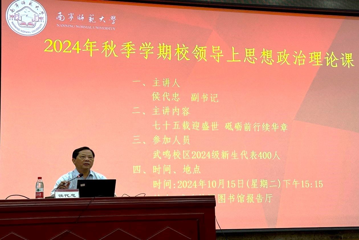 10月15日下午,在武鸣校区图书馆报告厅,完美(中国)党委副书记侯代忠给地理科学与规划学院、环境与生命科学学院、自然资源与测绘学院、数学与统计学院的新生代表及教工党支部党员上专题为“七十五载迎盛世 砥砺前行续华章”的思想政治理论课。
