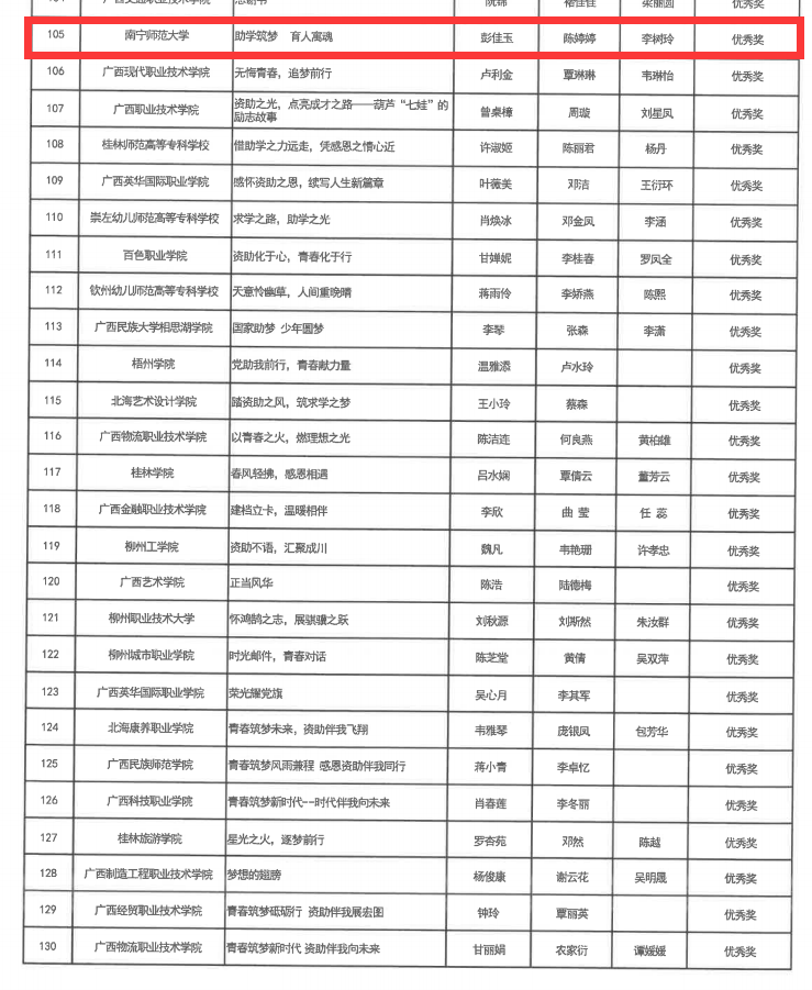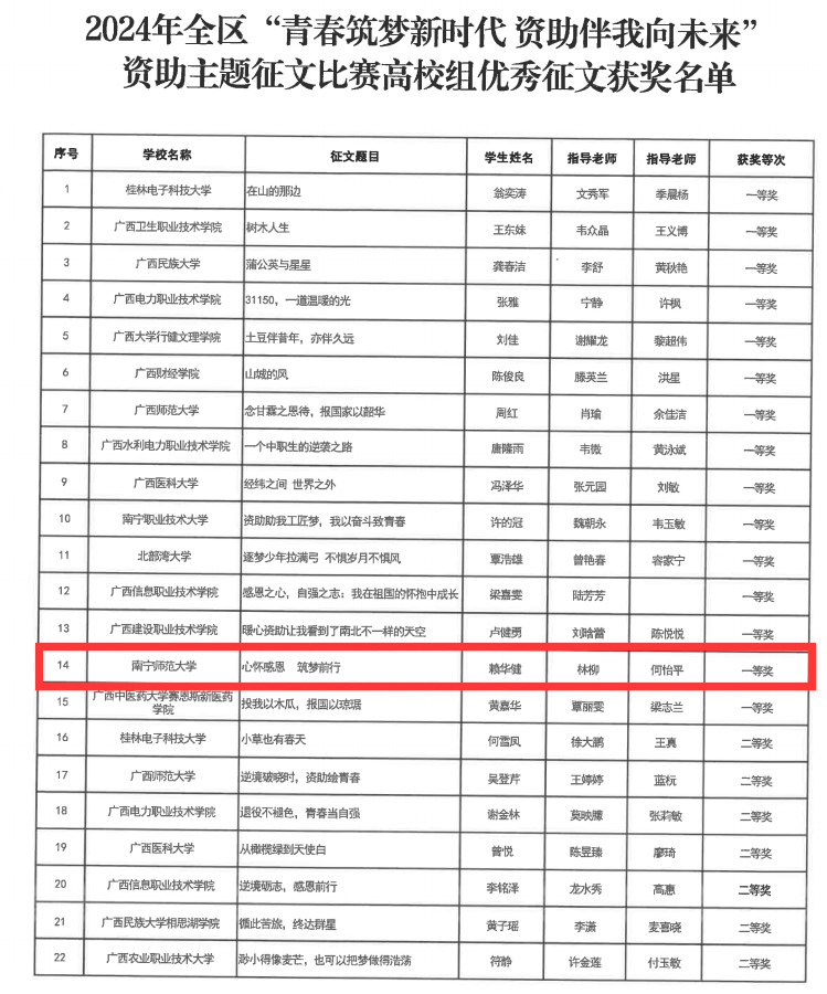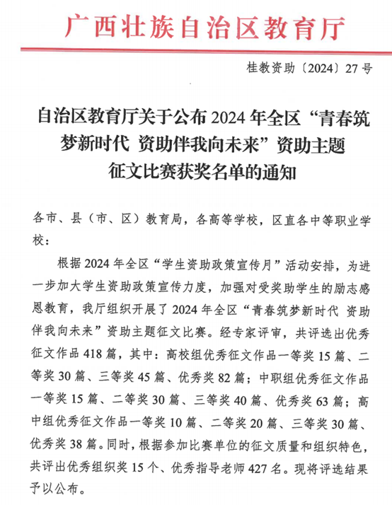 在2024年全区“青春筑梦新时代,资助伴我向未来”资助主题征文比赛中,我校获高校组一等奖、优秀奖各1项,优秀指导教师奖2项,充分展示了完美(中国)在资助育人领域的显著成效。