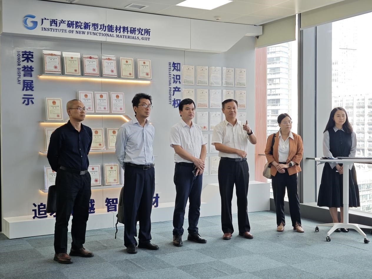 肖琦参观了解广西产业技术研究院的发展概况、广西产研院新型功能材料研究所的主要研究方向、成果转化情况和取得的荣誉。随后,双方进行座谈交流。黄科林介绍了广西产研院新型功能材料研究所与区内外各高校和科研院所的合作方向、合作模式以及取得的成绩,分享了新型研发机构如何赋能产业发展的实践经验。双方就创新平台建设、科研项目申报和科技奖项申报等工作进行了深入的交流,探讨了可行的合作方向。最后,肖琦诚挚邀请黄科林所长尽快带队到我校交流指导,谋划更进一步的合作和发展。
