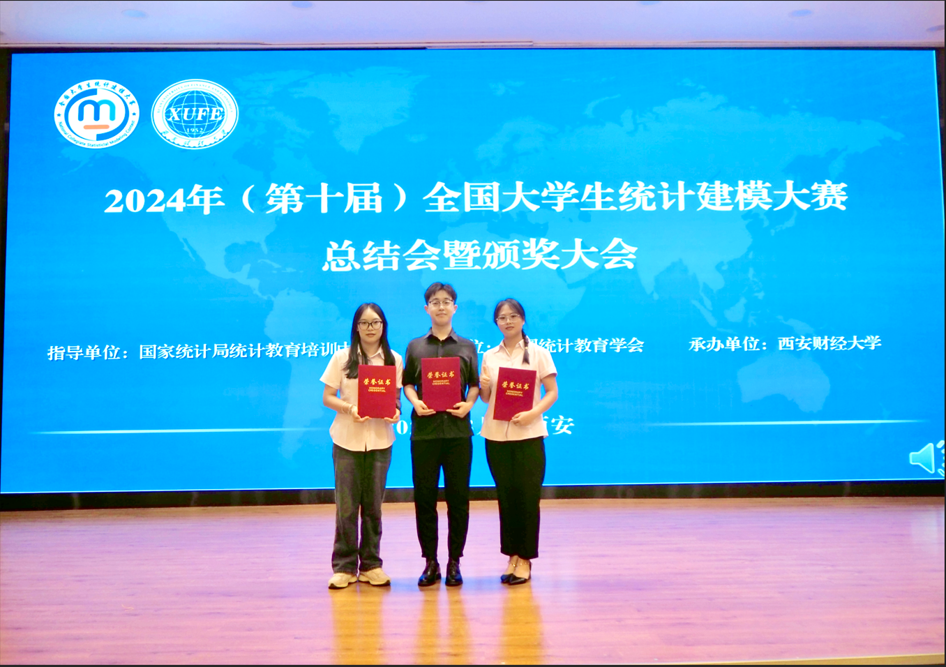 8月21-23日,第十届全国大学生统计建模大赛现场答辩赛及总结会在西安财经大学圆满落幕。我校数学与统计学院概率论与数理统计专业研究生苏婷、李炳炎和黎克红所组成的团队,经过校赛、省赛、国赛通讯评审、现场会议评审,成功入围国赛现场答辩赛,喜获国家二等奖。