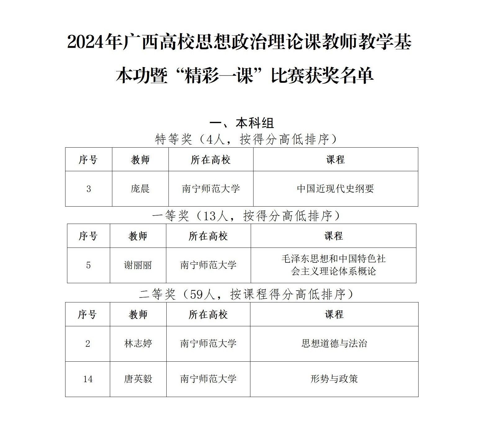 近日,自治区教育厅公布了2024年广西高校思想政治理论课教师教学基本功比赛暨“精彩一课”评选活动获奖名单,我校马克思主义学院教师庞晨荣获特等奖,谢丽丽荣获一等奖,林志婷、唐英毅荣获二等奖。