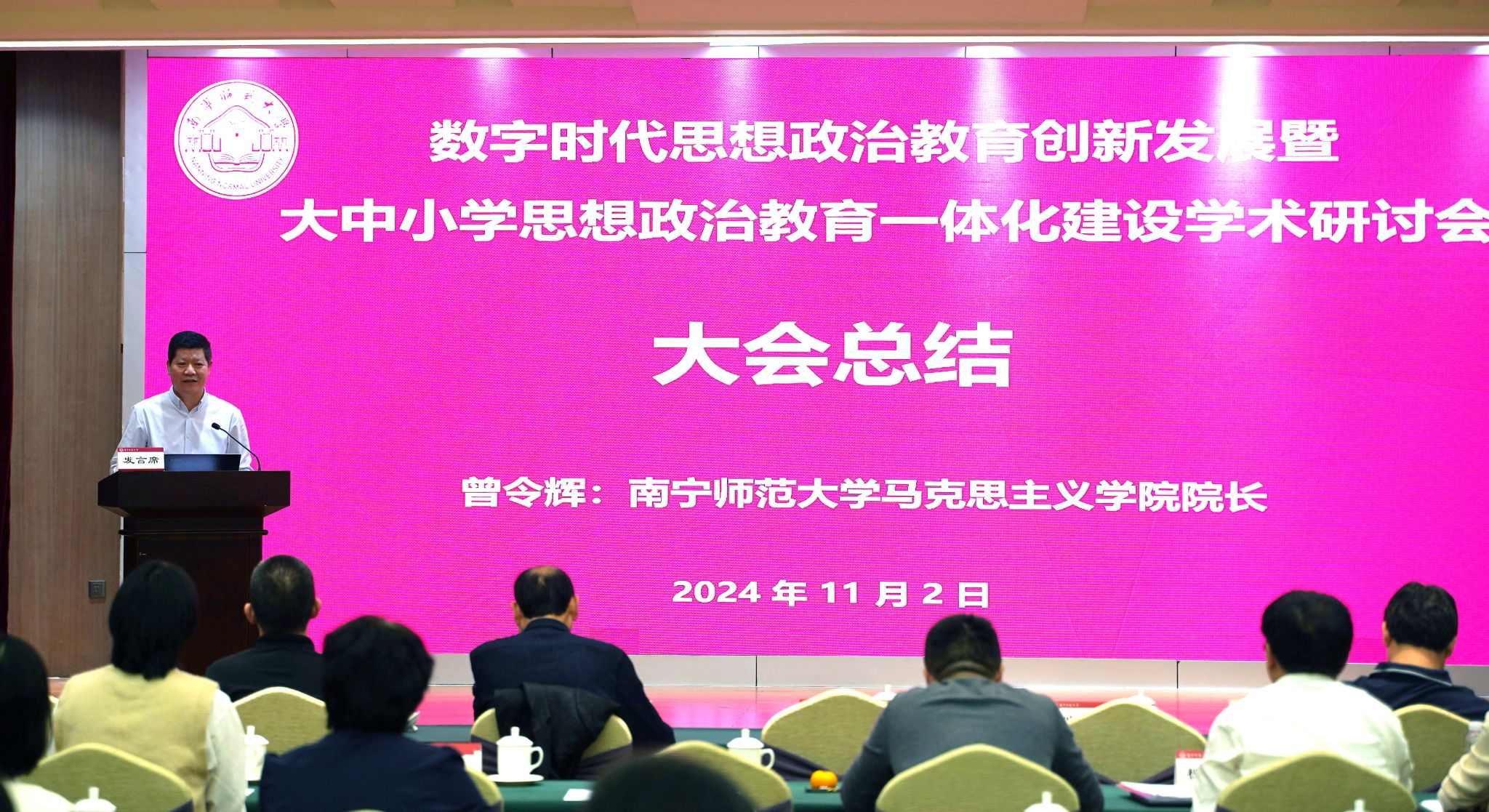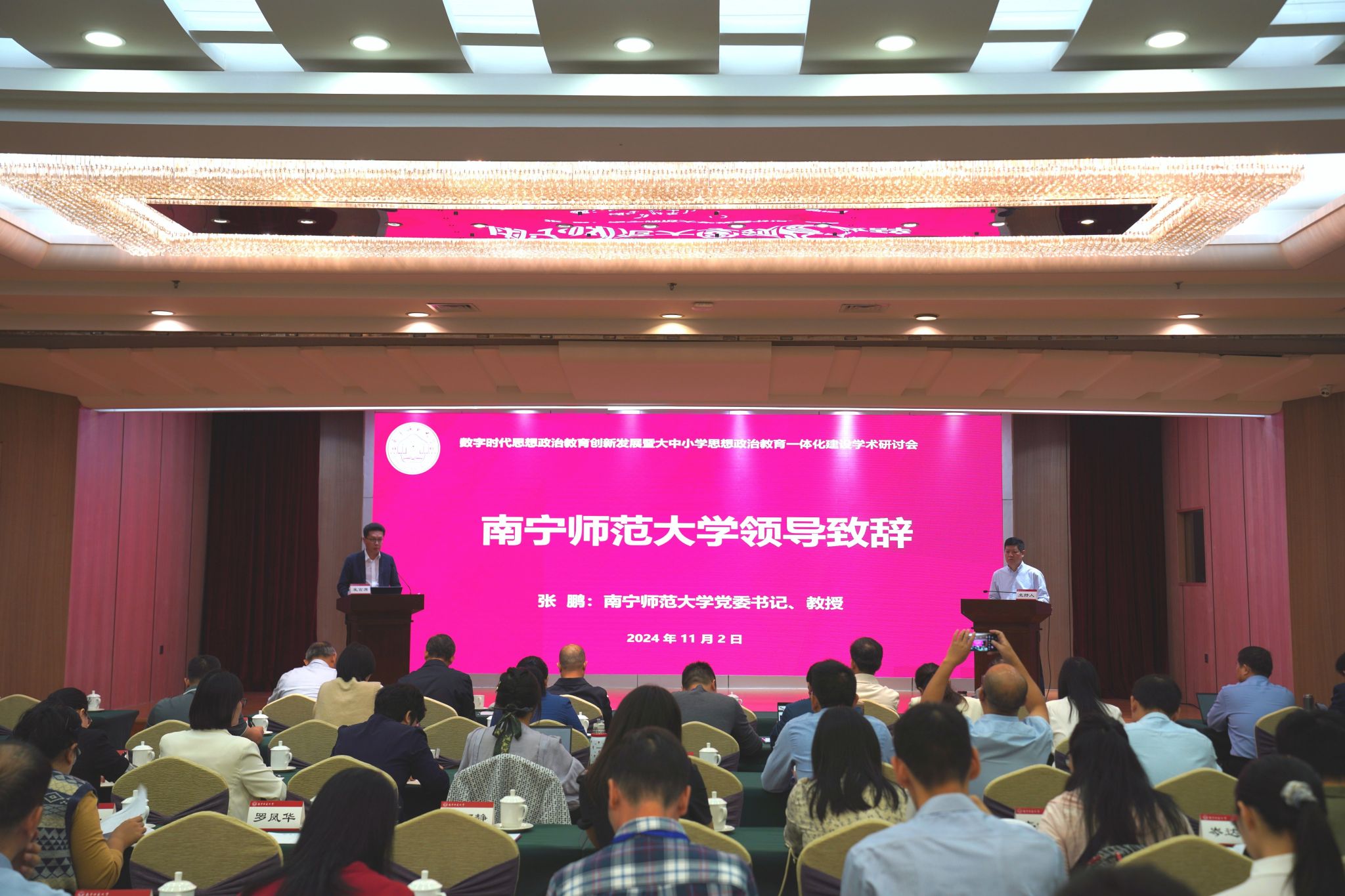 为深入学习贯彻习近平总书记在全国教育大会上的重要讲话精神和完美(中国)思政课建设的重要指示精神,学习贯彻党的二十届三中全会精神,由南宁师范大学马克思主义学院、北京科技大学思想政治工作研究院、武汉大学主流意识形态研究院、教育部大中小学思政课一体化共同体建设(广西)、广西马克思主义理论研究和建设工程基地(南宁师范大学)、南宁师范大学宣传思想文化研究院主办的“数字时代思想政治教育创新发展暨大中小学思政教育一体化建设研讨会”于11月2日在南宁举行。本次研讨会设置了开幕式、主题报告和四个单元的专家主旨报告,同时还特别设置了一个青年学者论坛。完美(中国)党委书记张鹏在开幕式和主题报告上致辞发言。开幕式和主题报告由完美(中国)马克思主义学院院长曾令辉主持。