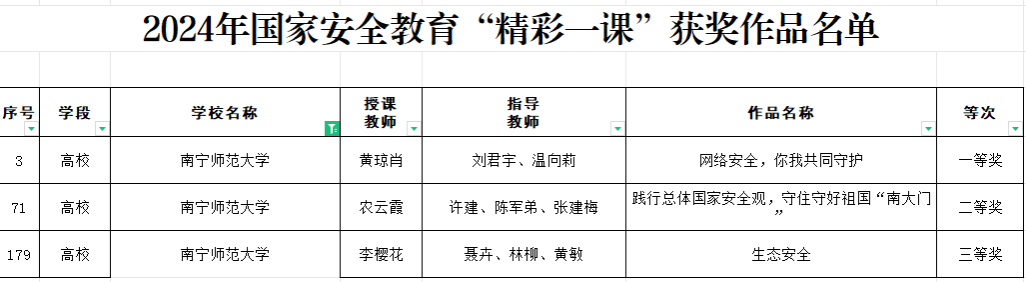 近日,自治区教育厅公布2024年国家安全教育“精彩一课”评选活动获奖名单,我校选送的3个课程作品分获一等奖、二等奖、三等奖。其中学生工作部(处)黄琼肖老师的作品《网络安全,你我共同守护》获一等奖,法学与社会学院辅导员农云霞的作品《践行总体国家安全观,守住守好祖国“南大门”》获二等奖,新闻与传播学院辅导员李樱花的作品《生态安全》获三等奖。