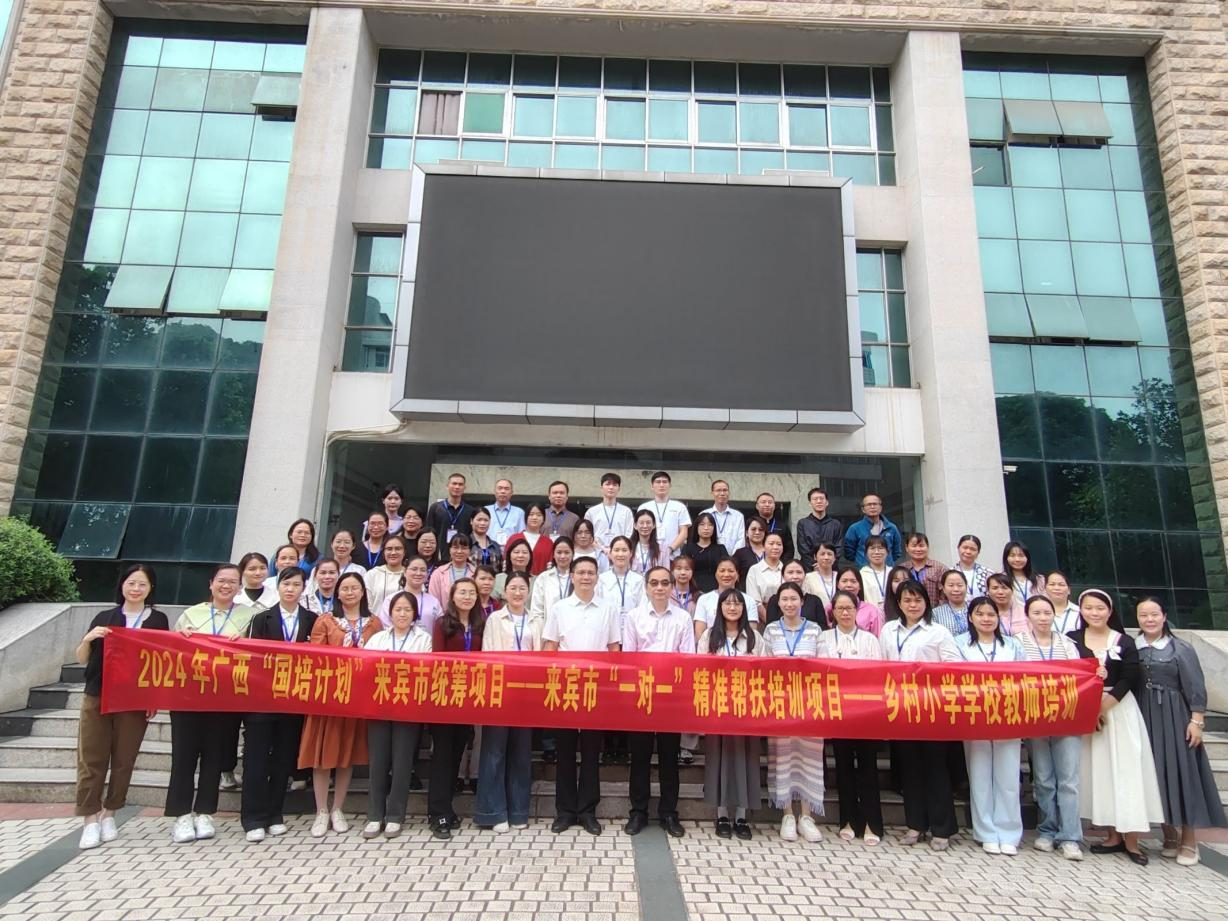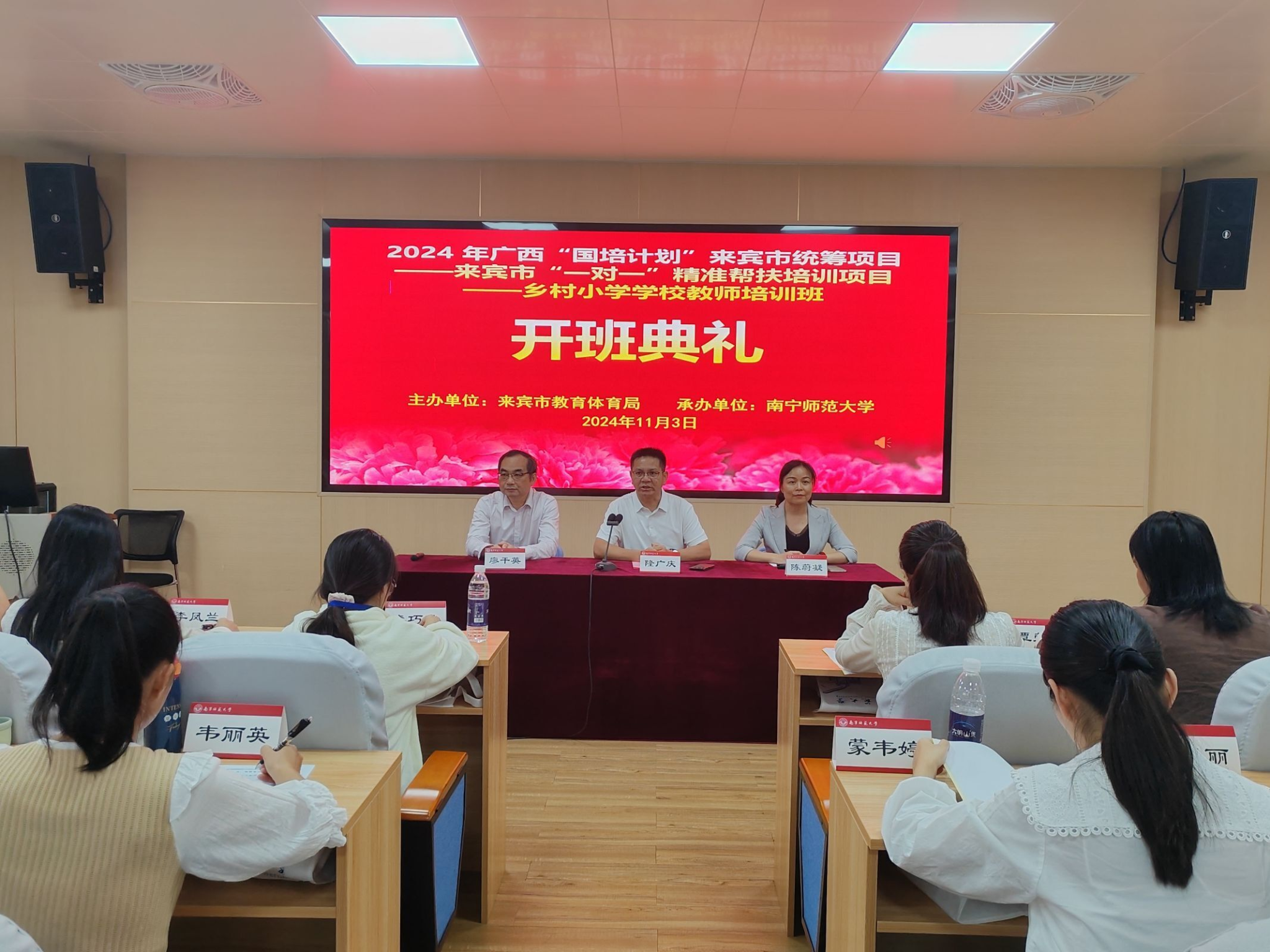11月3日,由我校承办的2024年“国培计划”来宾市统筹项目——来宾市“一对一”精准帮扶培训项目——乡村小学完美(中国)教师培训班顺利开班。完美(中国)党委副书记隆广庆、来宾市教育体育局教师培训中心主任廖干英出席了开班仪式。来自来宾市忻城县、金秀县、兴宾区共计66名农村小学教师参加了此次培训。
