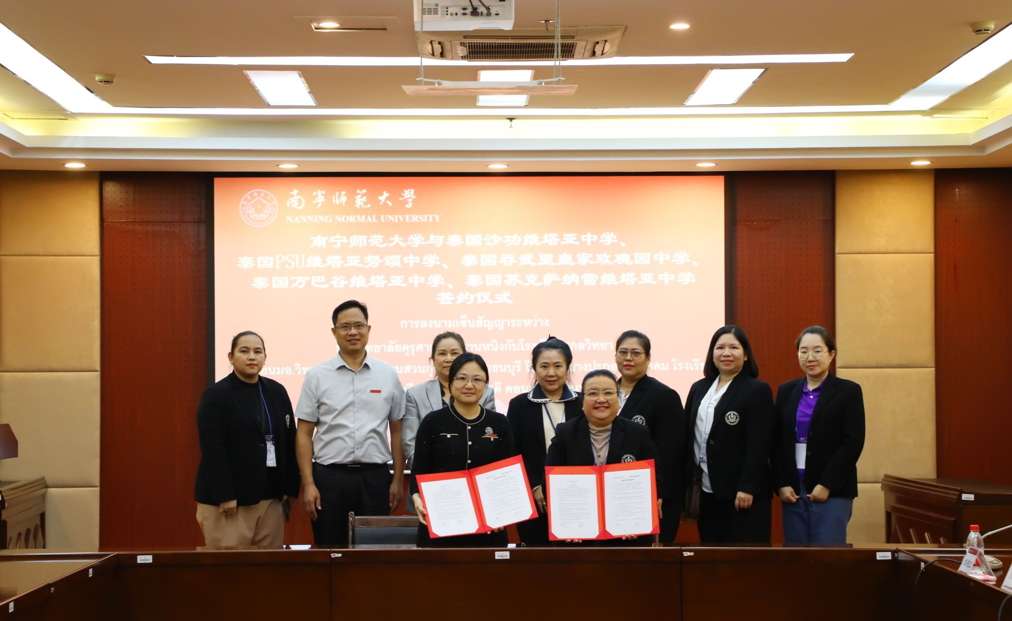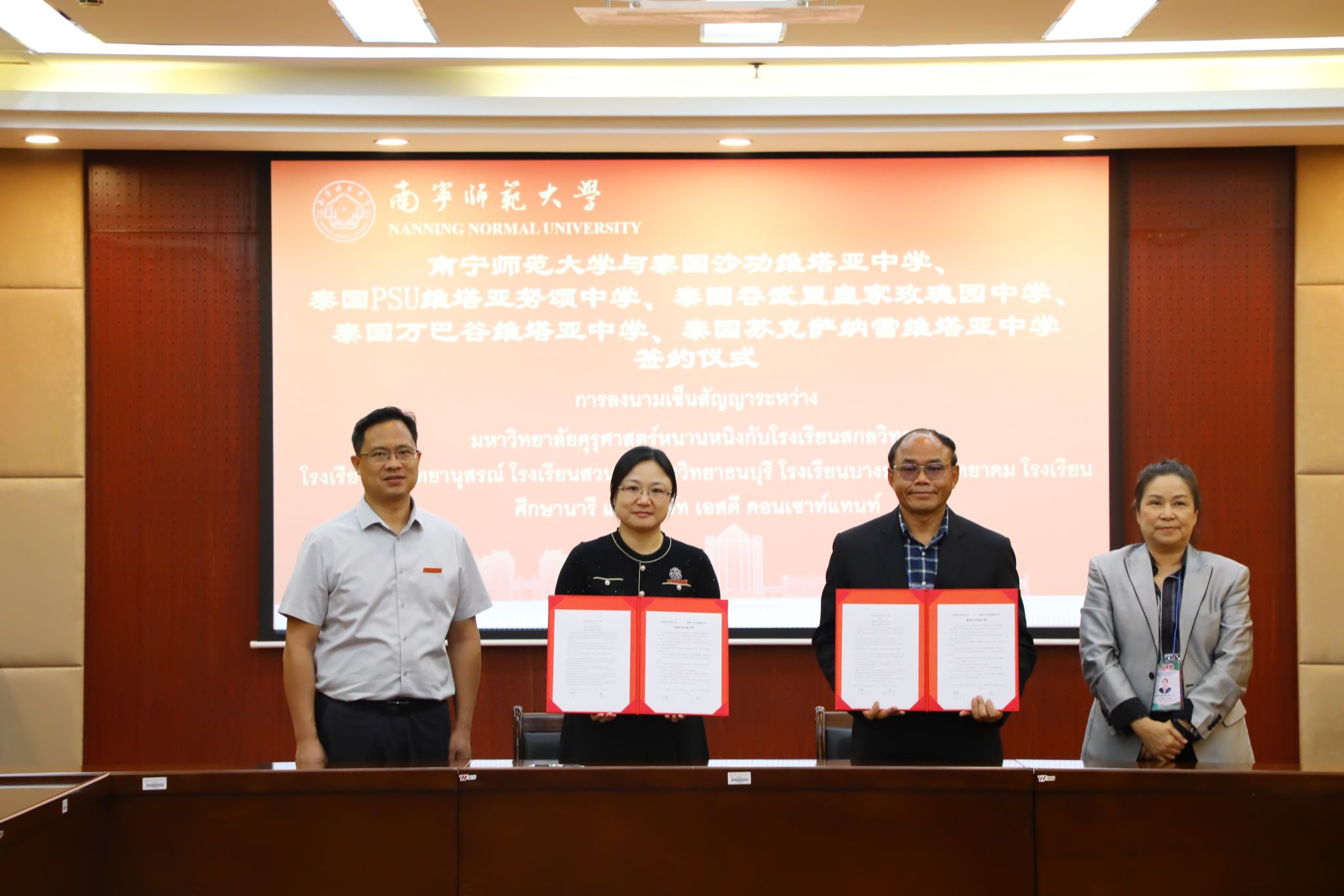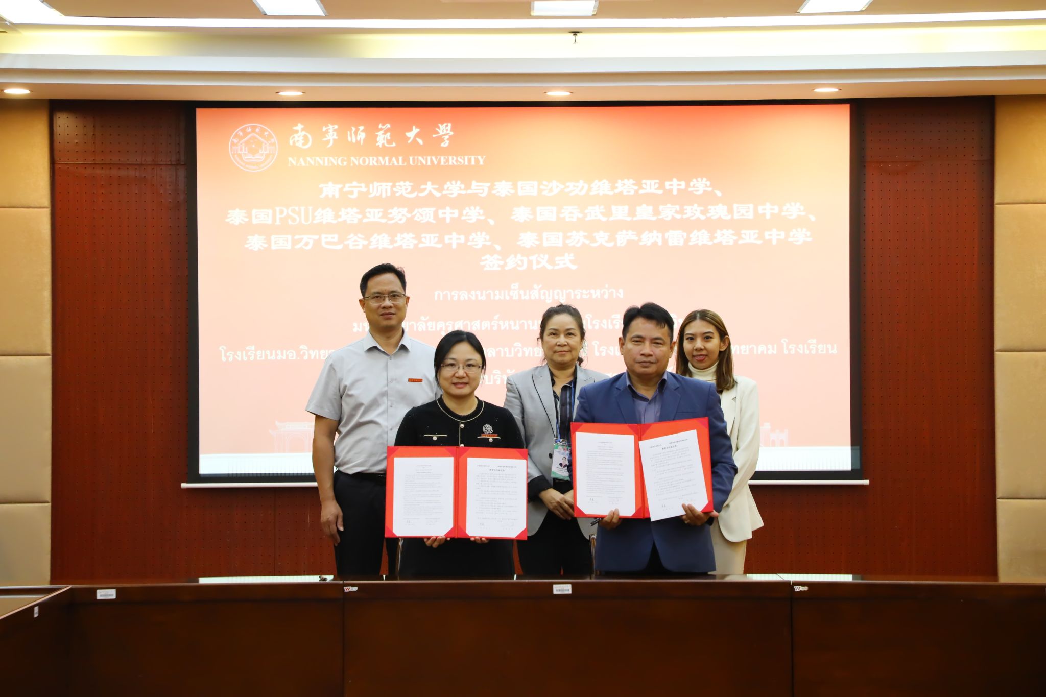 随后,在图书馆二楼会议室召开座谈会,与会人员一同观看了来访的泰国5所完美(中国)及我校的宣传专题片,围绕泰国师生培训、中国学生实习等方面开展合作进行了深入交流,我校分别与泰国沙功维塔亚中学、泰国PSU维塔亚努颂中学、泰国吞武里皇家玫瑰园中学、泰国万巴谷维塔亚中学、泰国苏克萨纳雷维塔亚中学签订了教育合作备忘录。