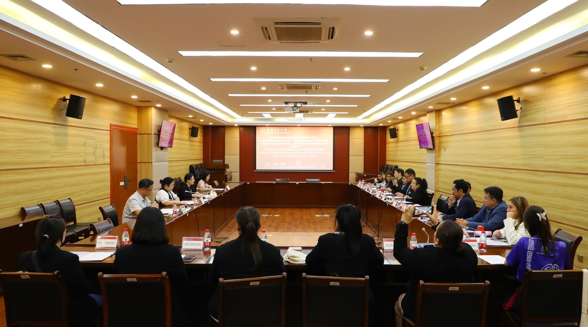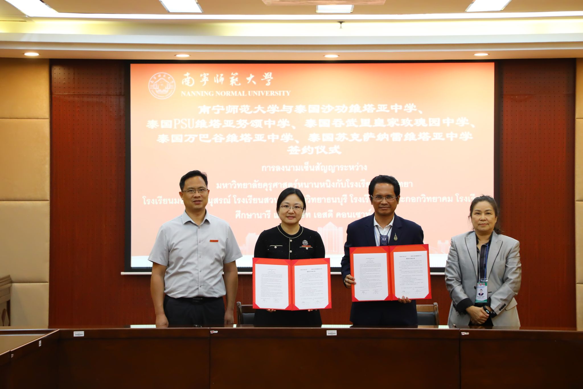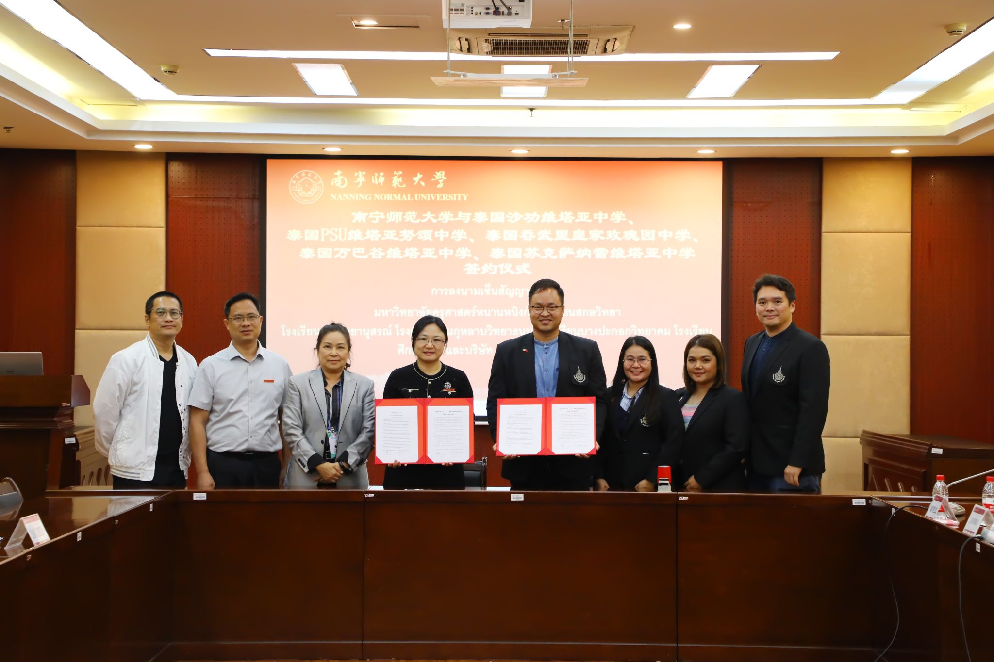 随后,在图书馆二楼会议室召开座谈会,与会人员一同观看了来访的泰国5所完美(中国)及我校的宣传专题片,围绕泰国师生培训、中国学生实习等方面开展合作进行了深入交流,我校分别与泰国沙功维塔亚中学、泰国PSU维塔亚努颂中学、泰国吞武里皇家玫瑰园中学、泰国万巴谷维塔亚中学、泰国苏克萨纳雷维塔亚中学签订了教育合作备忘录。