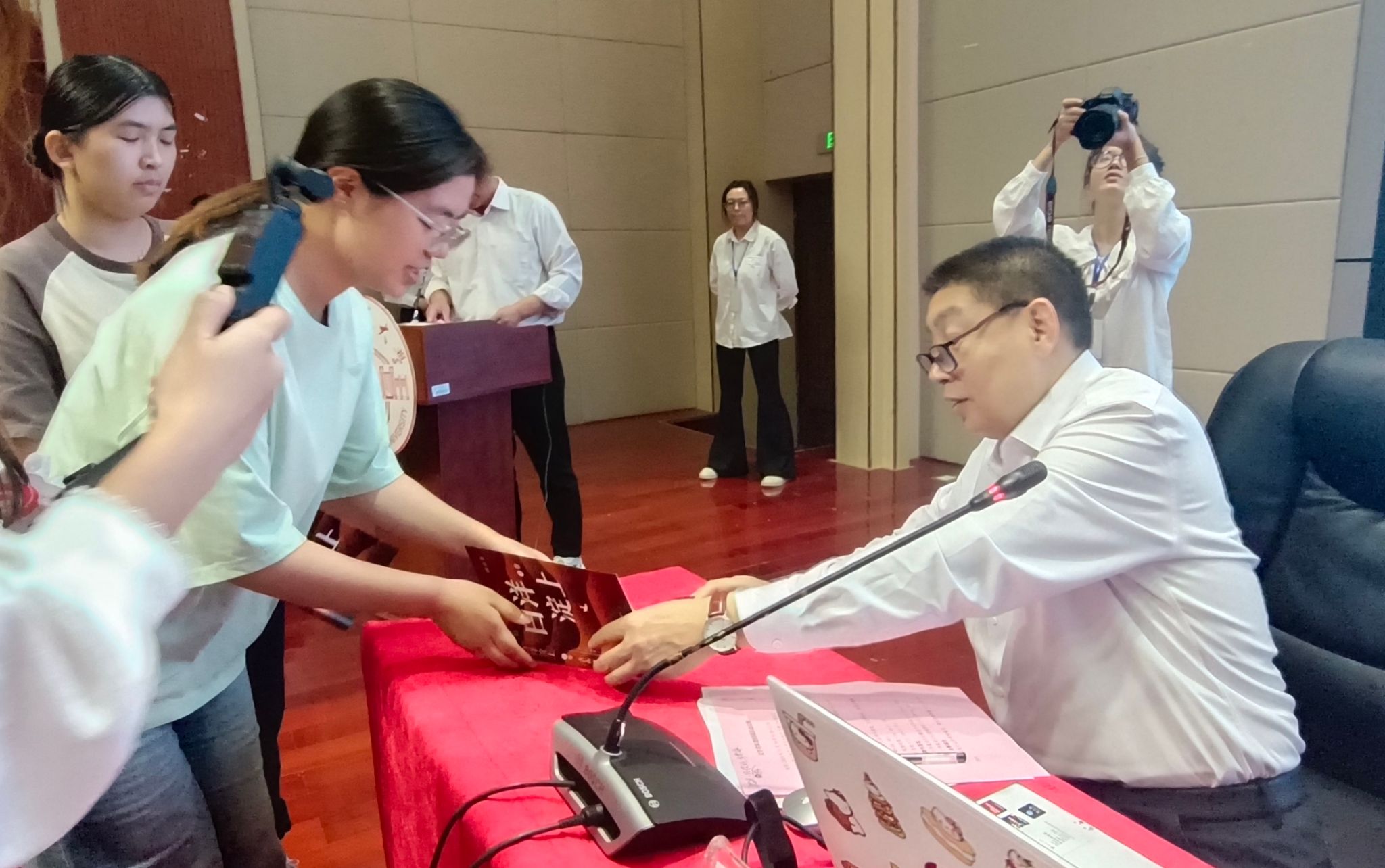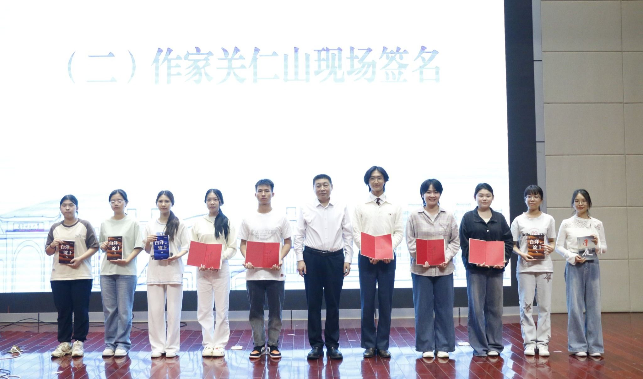 在随后的现场签名环节,学生们纷纷拿着书籍上台,关仁山为同学们一一签名。