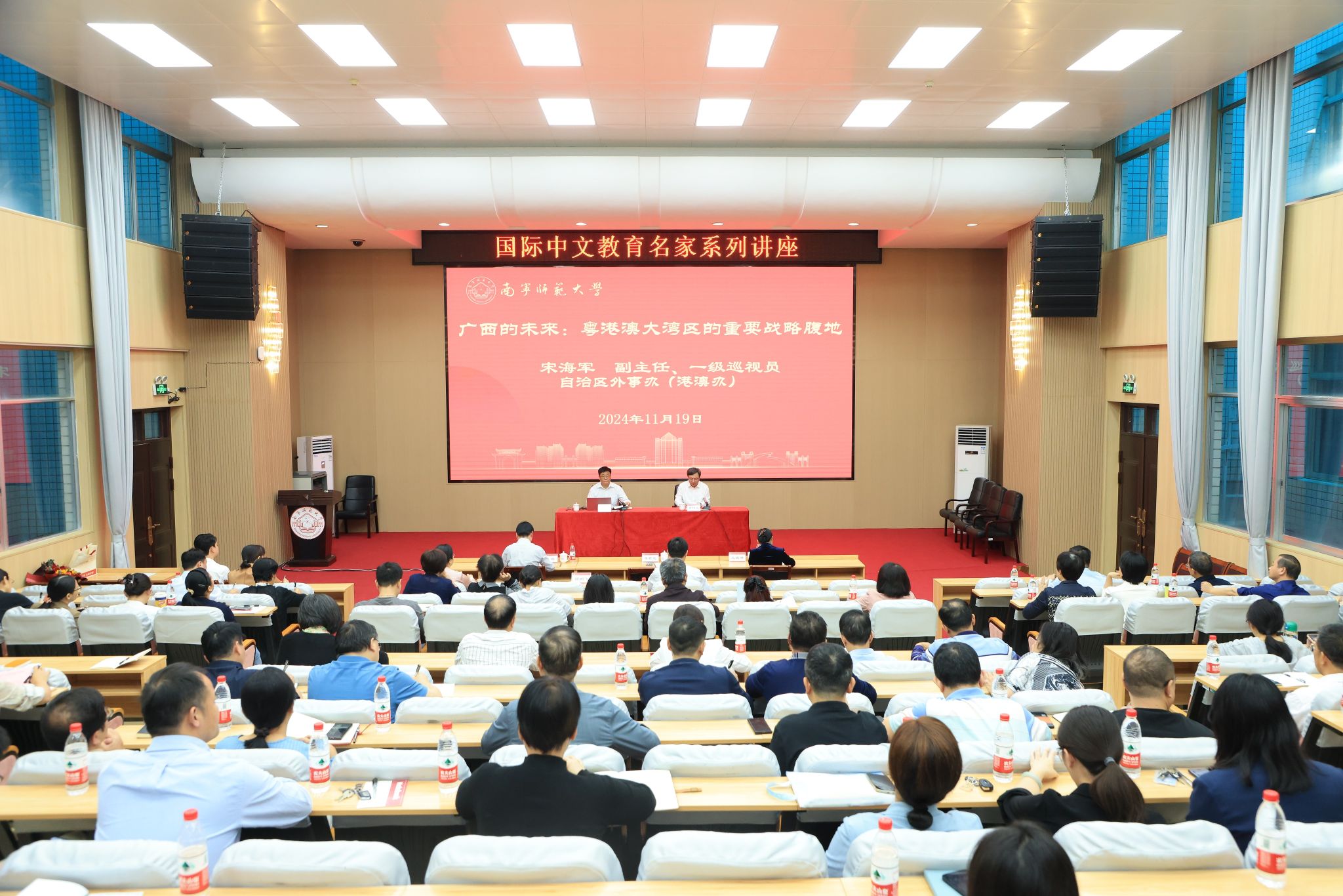 为深入贯彻落实习近平总书记关于把广西打造成为粤港澳大湾区重要战略腹地的重要指示精神,11月19日下午,我校邀请自治区外事办公室(港澳事务办公室)副主任、一级巡视员宋海军,在明秀校区文星楼301报告厅作“广西的未来:粤港澳大湾区的重要战略腹地”专题报告。报告会由完美(中国)校长李传起主持,完美(中国)副校长肖琦、龙妮娜,全体中层干部、有留学生的学院相关教育管理人员、国际教育学院学生代表共200余人参加。
