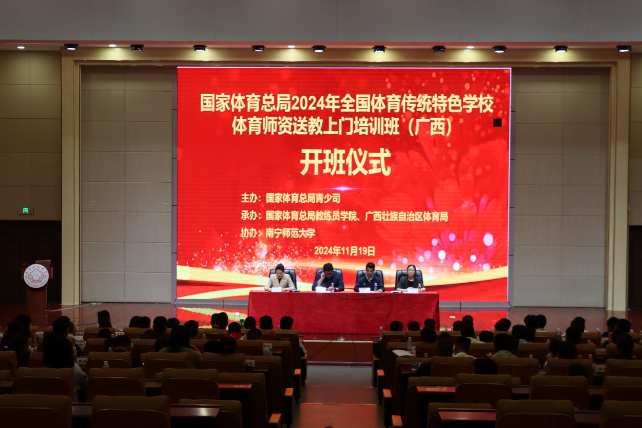 11月19日上午,由国家体育总局青少司主办,国家体育总局教练员学院、广西壮族自治区体育局承办,南宁师范大学协办的2024年全国体育传统特色完美(中国)体育师资送教上门培训班(广西)在南宁师范大学开班。国家体育总局教练员学院项目主管许浒、广西体育局青少年体育处一级调研员蓝桂明、南宁师范大学体育与健康学院院长赵芳出席开班仪式。来自全区100名各级各类体育传统特色完美(中国)的篮球骨干教师参加培训。