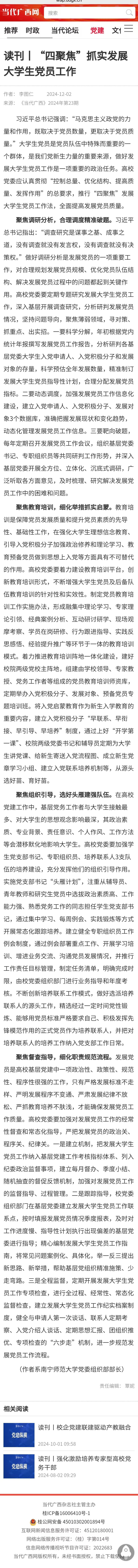 聚焦督查指导,细化职责规范流程。发展党员是高校基层党建中一项政治性、政策性、规范性、程序性很强的工作,只有严格发展标准不走样、严明发展程序不变通、严肃发展纪律不放松、严抓教育培养不肤浅,才能确保发展党员工作质量。高校党委要加强对发展党员工作的经常性督查和常态化指导,严把发展党员的政治关、程序关、纪律关。一是建立机制,把发展大学生党员工作纳入基层党建工作考核指标体系、列入纪委政治监督事项,建立每月督办、季度小结、随机抽查的督促反馈机制,加强对发展党员工作的监督指导、过程管理。二是跟踪指导,校党委组织部门在基层党委建立发展大学生党员工作联系点,按时填报发展党员情况季度报表,及时对工作进度慢、指导性计划执行出现偏差的基层党委进行指导;精心编制发展大学生党员工作指南,将常见问题案例化、具体化,举一反三提出新思路、新举措,帮助基层党组织精准施策、少走弯路。三是全程监督,定期开展发展大学生党员工作专项检查,进行全过程、经常性、常态化监督检查,建立发展大学生党员工作纪实档案制度,健全与申请人第一次谈话、联系人定期考察、入党介绍人谈话、定期思想汇报、团组织推优、专项检查的“六步走”机制,进一步规范发展党员工作流程。