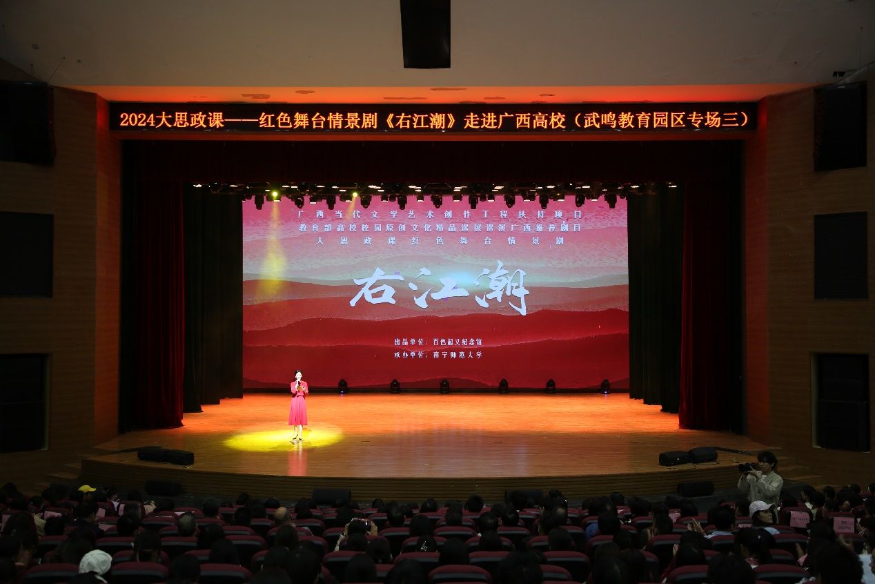 2023年12月,“大思政课”红色舞台情景剧《右江潮》在南宁武鸣教育园区公益演出3场,逾2000名来自南宁师范大学、广西医科大学、广西民族大学等7所高校的师生到场观看。2024年,在邓小平同志诞辰120周年、百色起义95周年、黄文秀同志牺牲5周年之际,百色起义纪念馆与南宁师范大学在原有内容基础上进一步丰富、提升,更加聚焦红色文化中的思政元素,剧本内容更加丰富,演员表演更加生动,实现“大思政课”建设与中华优秀传统文化价值融会贯通,深受广大高校师生的喜爱和好评。