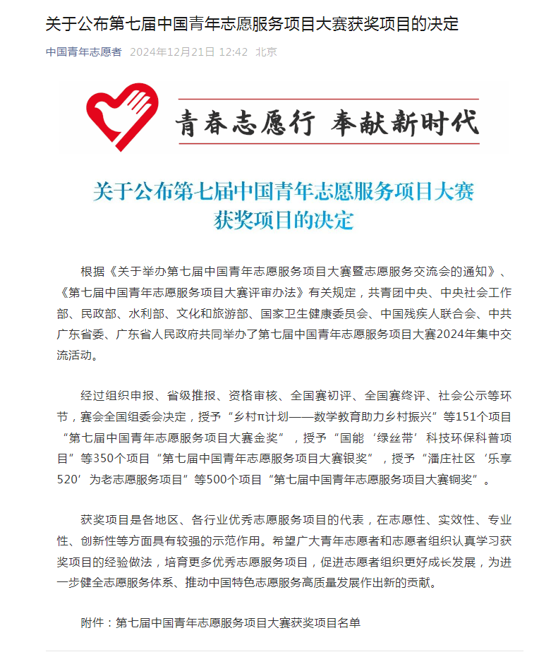 我校曾被授予“全国志愿助残基地”,项目也曾入选2024年共青团为老志愿服务和助残志愿服务项目展示,荣获广西优秀志愿者项目等,并在2024年广西志愿服务项目大赛中荣获铜奖。
