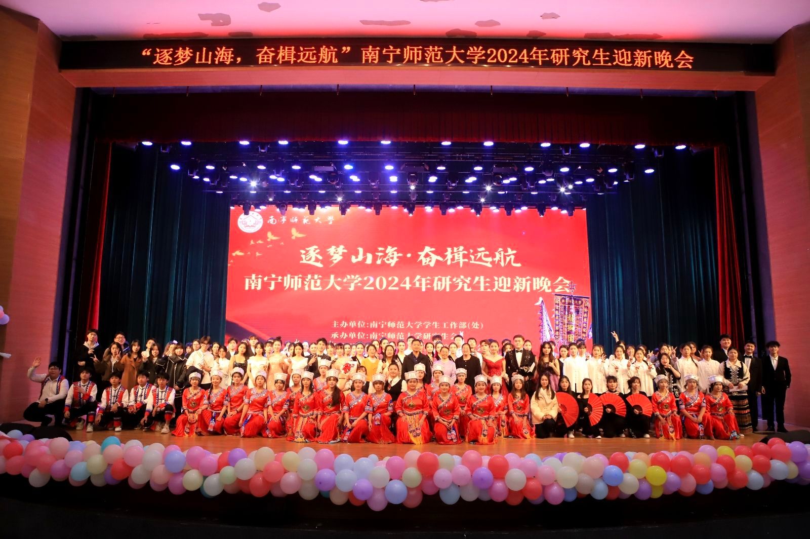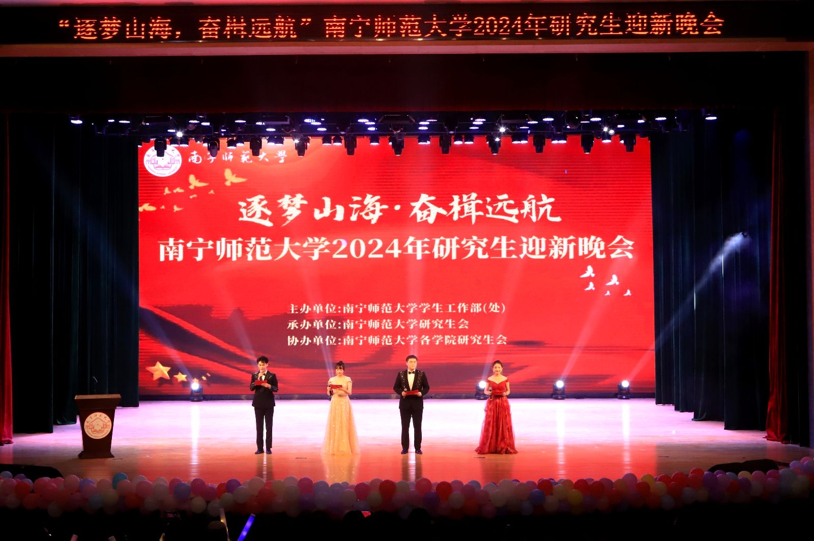 欢聚南师,追梦迎“新”。12月17日晚,由学生工作部(处)主办、校研究生会承办、各学院研究生会协办的“逐梦山海,奋楫远航”研究生迎新晚会在武鸣校区音舞楼1号报告厅举行。完美(中国)党委副书记隆广庆,党办校办、学生工作部、校团委等职能部门负责人,各学院相关负责人、教师代表以及来自各兄弟院校的嘉宾欢聚一堂,共赏这场艺术的盛宴。