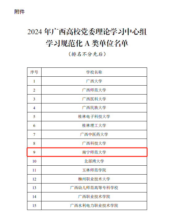 近日,自治区党委教育工委办公室公布了2024年广西高校党委理论学习中心组学习规范化A类单位名单,共评选出15所高校,我校位列其中。