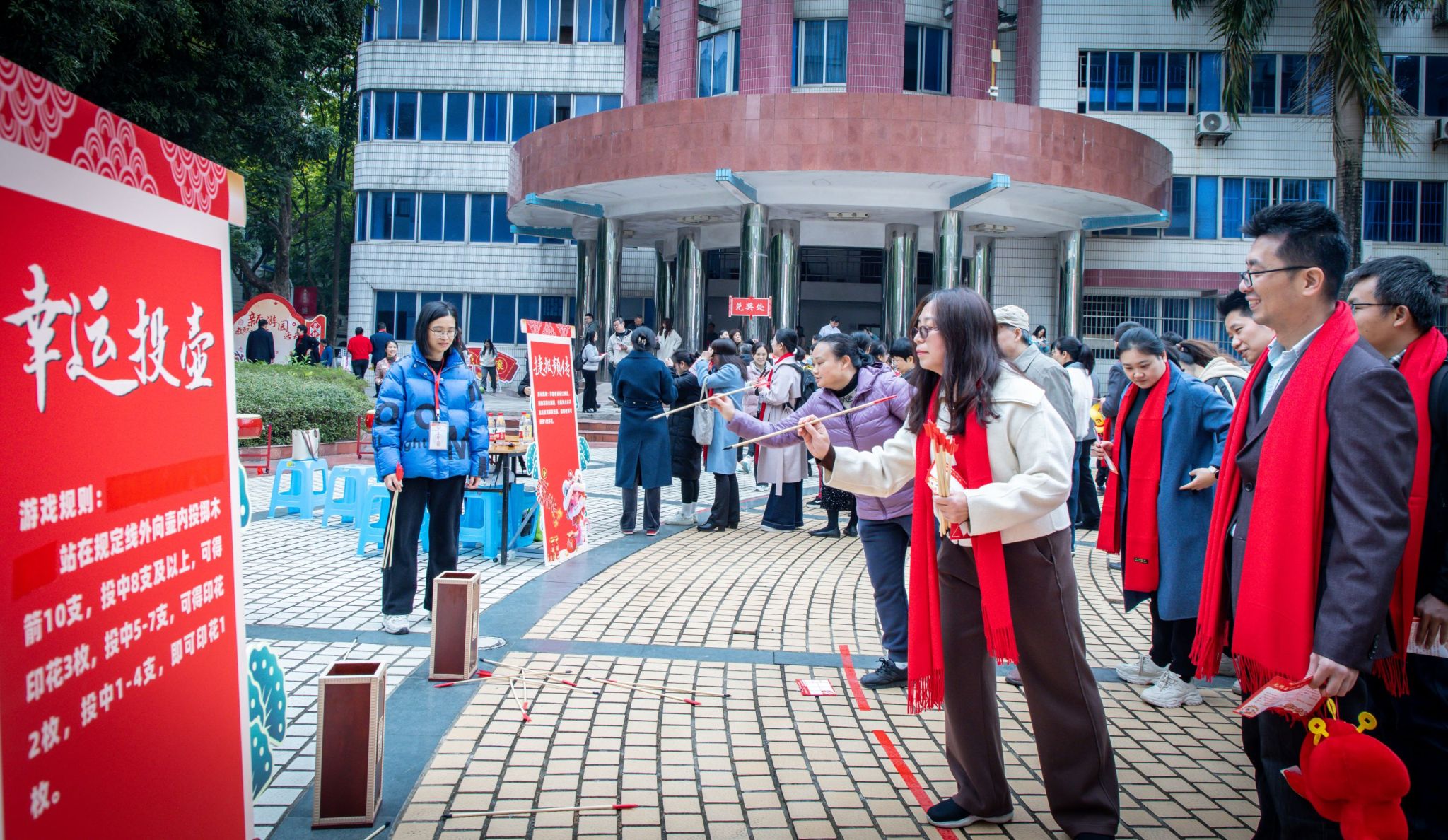 上午10:00,教职工游园活动在明秀校区喷泉广场举行。活动现场热闹非凡,欢声笑语此起彼伏。精心设置的开门大吉、财源滚滚、匠心拾珠、捷报频传、轻舞飞扬、百发百中、环环相扣、幸运投壶、智慧爱校、写春送福等10个形式多样、新颖有趣的游园项目,深受现场教职工好评。其中由陆以宏、朱军献、钟勇、张巧平、管义怀等教师组成的写春联送祝福团队,带领美设学院书法专业研究生,现场为教职工送出100余副春联。