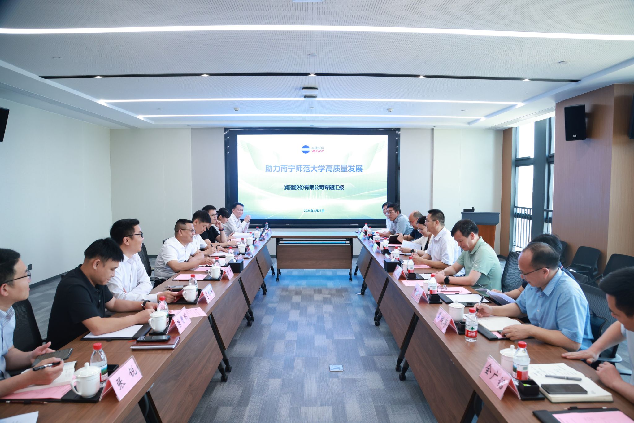 李群伟对隆广庆一行的到访表示热烈欢迎,并感谢南宁师范大学一直以来对润建股份有限公司的支持和帮助。他表示,期待与南宁师范大学开展多领域深度合作,充分发挥各自优势,在共建实验室、共育师资、推进科技成果转化等方面加大投入,实现资源共享、优势互补、共同发展,为推动区域经济发展和科技创新贡献力量。