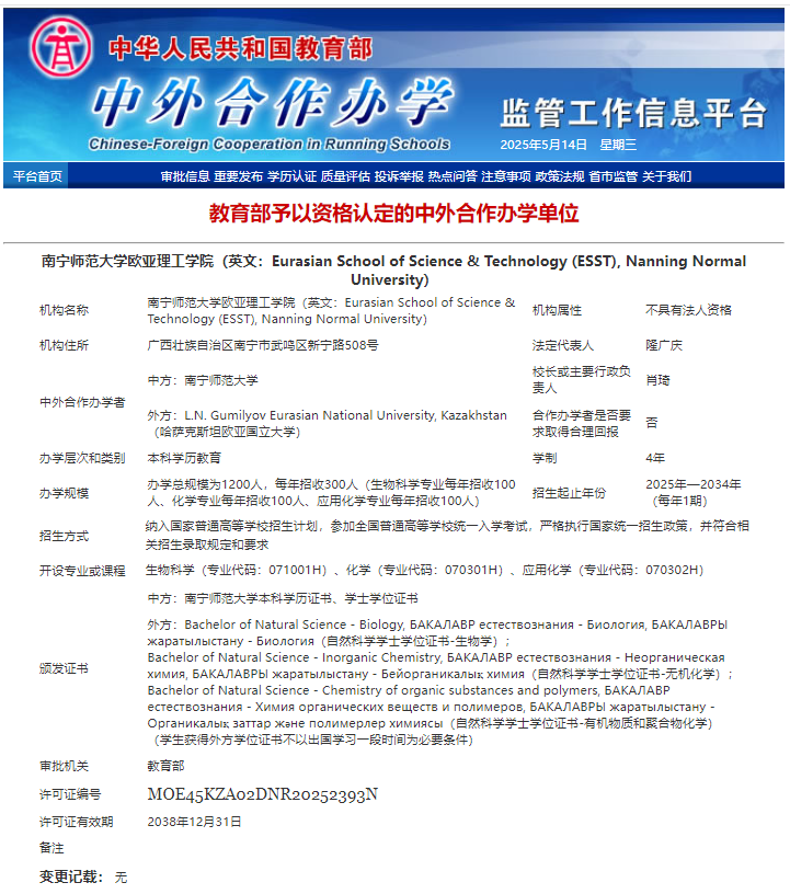 5月20日,教育部正式批复,同意我校与哈萨克斯坦欧亚国立大学合作举办非独立法人中外合作办学机构——南宁师范大学欧亚理工学院。该机构不仅是我校首个获教育部批准成立的中外合作办学机构,也是我国首个与哈萨克斯坦共和国合作举办的中外合作办学机构,为中哈文明互鉴与科技教育融合开辟了新路径。