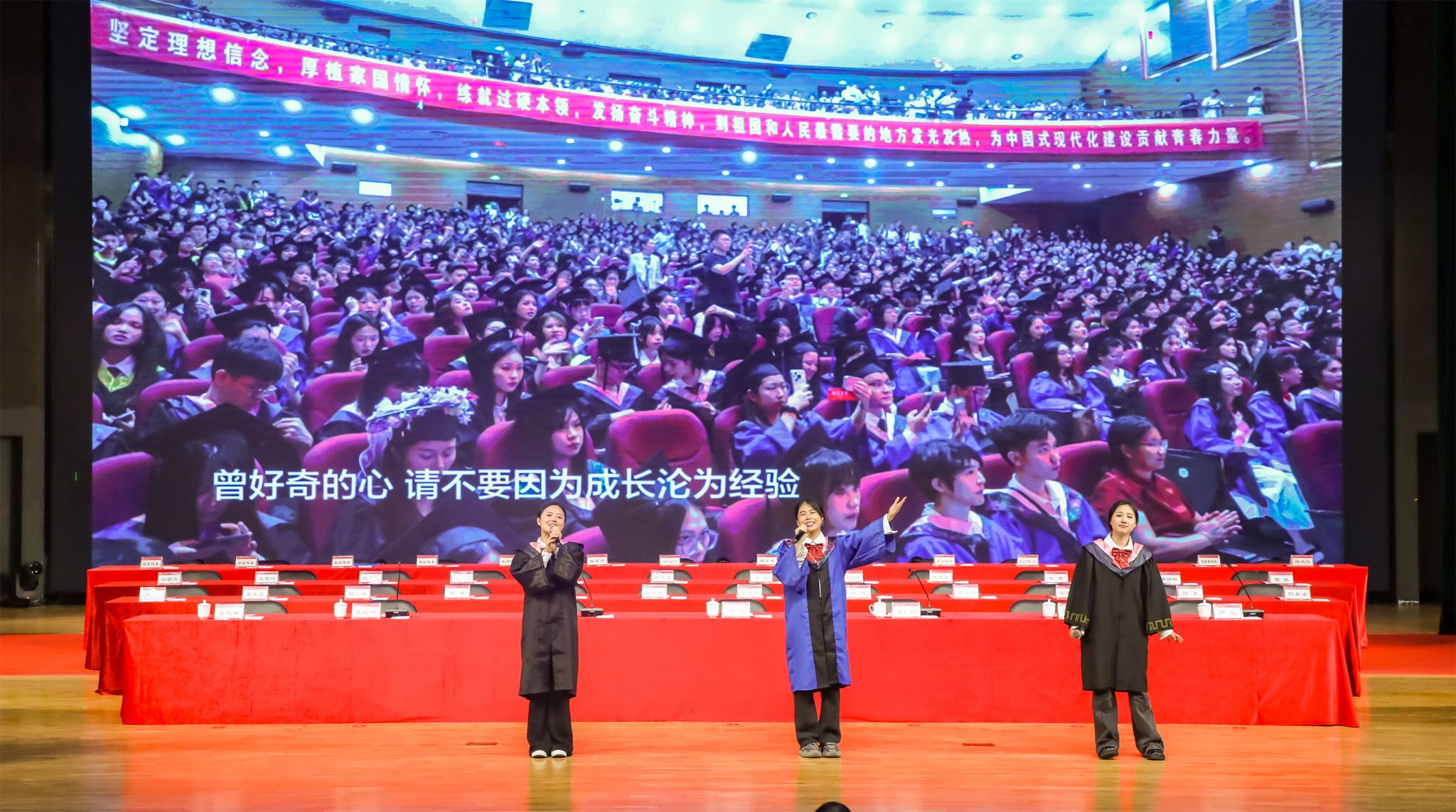 物理与电子学院韦师同学、教育科学学院肖沅依同学分别代表本科生、研究生全体毕业生发言。他们分享了满载收获与感动的在校求学成长经历,表达了对母校和老师的不舍与感激,表示未来将怀揣“德才并育,知行合一”的精神,伴着“待青春梦圆,郁郁桃李,芳华人间”的南师歌声,不负韶华,挺膺担当,踔厉奋发,逐梦远航。
