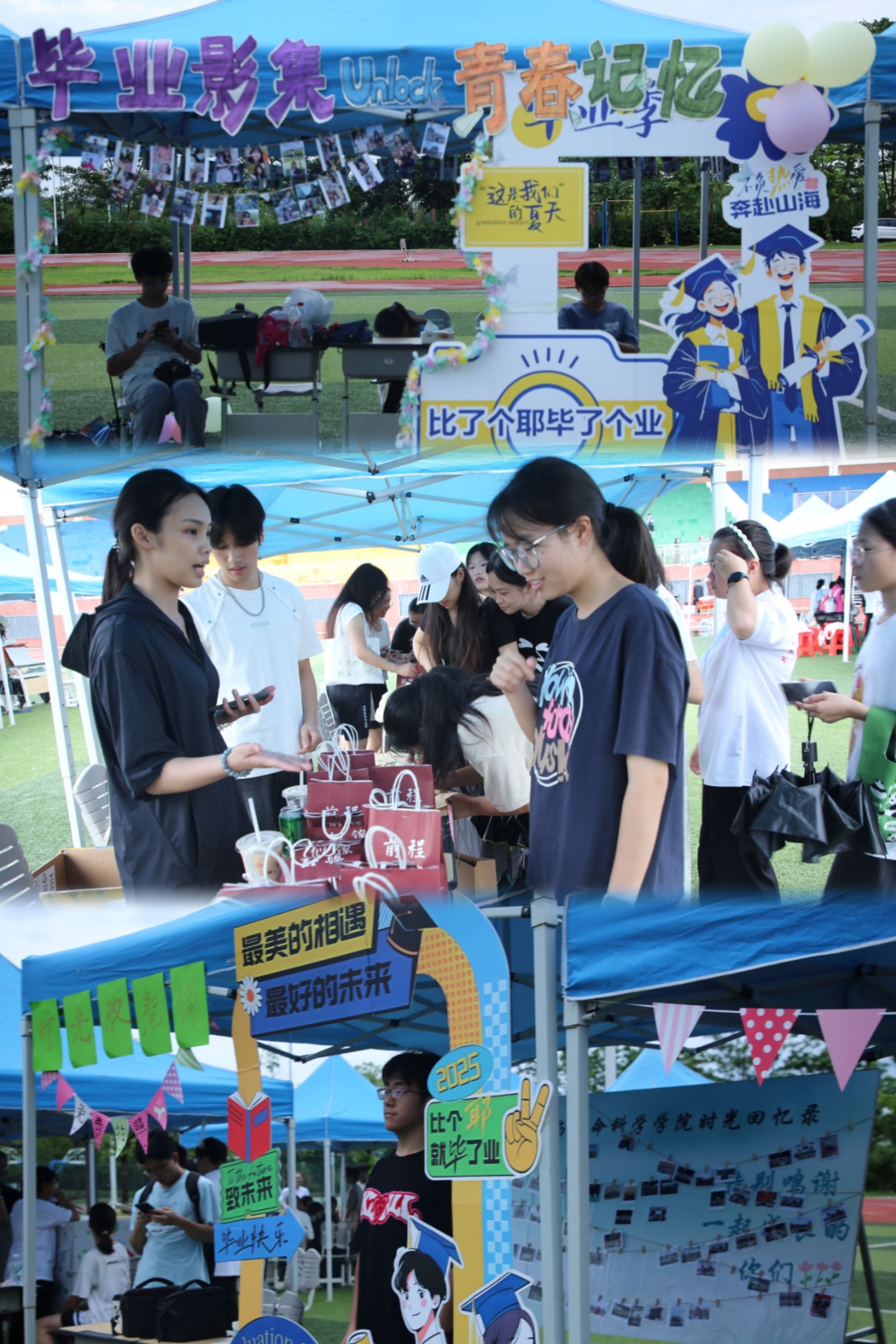 活动当日下午,“青春不散场”创意市集率先登场,五大特色专区成为校园焦点,在“拾光盲盒屋”中,各学院将礼物装入“知识盲袋”,附上师长暖心寄语;走进“青春记忆工坊”,同学们将旧T恤、课本改造成帆布包、相框等创意作品,让回忆焕发新生;前往“拾光慢递邮局”,毕业生们纷纷写下给自己未来的信,约定与成长的美好邂逅;步入“光影长廊”,观看毕业生们四年的青春变化;来到跳蚤集市,有无人售摊、物物交换、创新创业摊位等,现场热闹非凡。