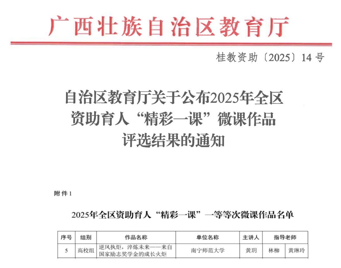近日,自治区教育厅公布了2025年全区资助育人“精彩一课”微课作品评选结果,我校黄玥老师的微课作品《逆风执炬,淬炼未来——来自国家励志奖学金的成长火炬》荣获一等等次。本次活动由自治区教育厅主办,旨在深入落实立德树人根本任务,持续深化发展型资助育人体系建设,集中展现新时代资助工作者的综合素质、专业水平和育人素养,为受奖助学生的成长成才提供科学指引与精神滋养。