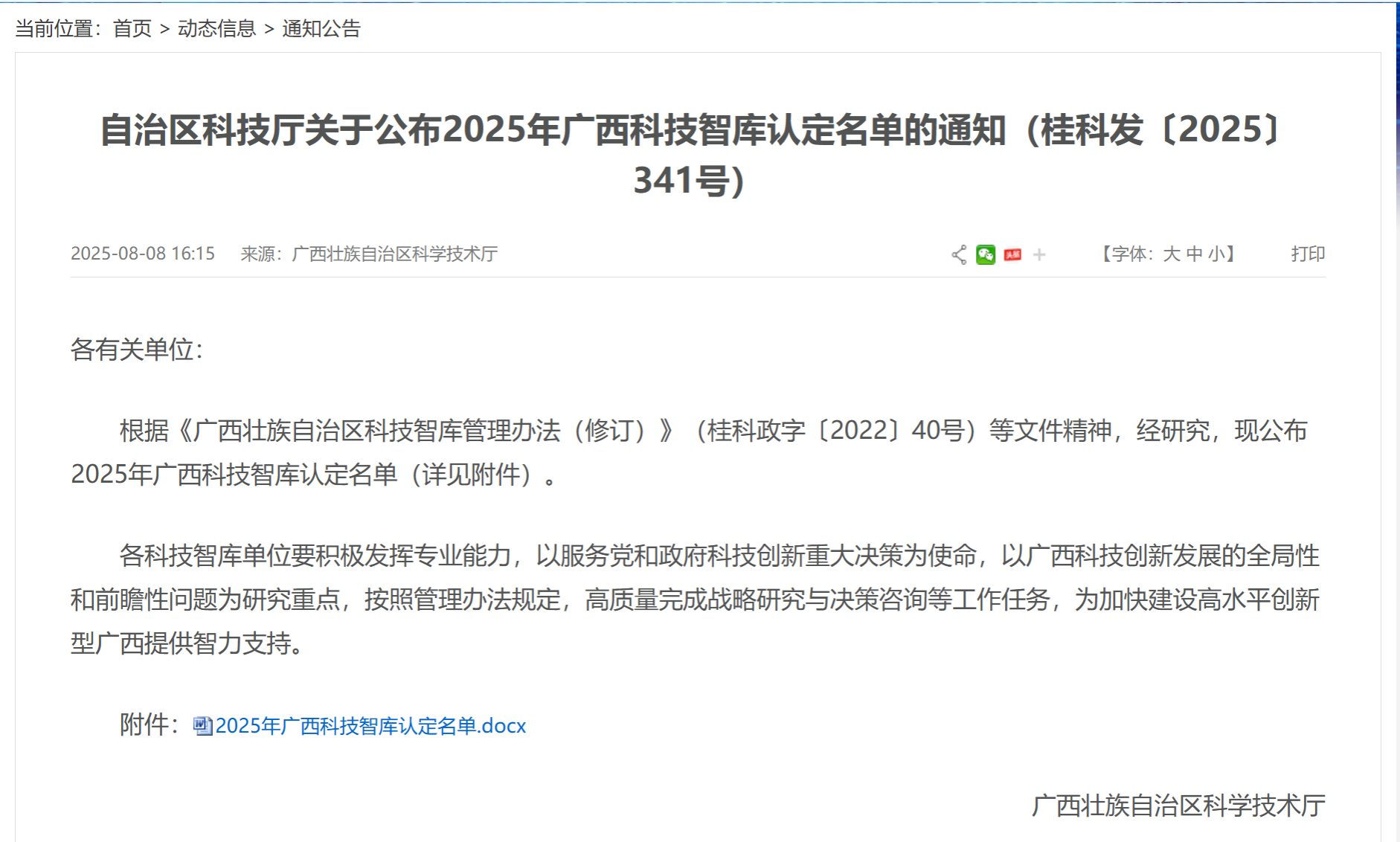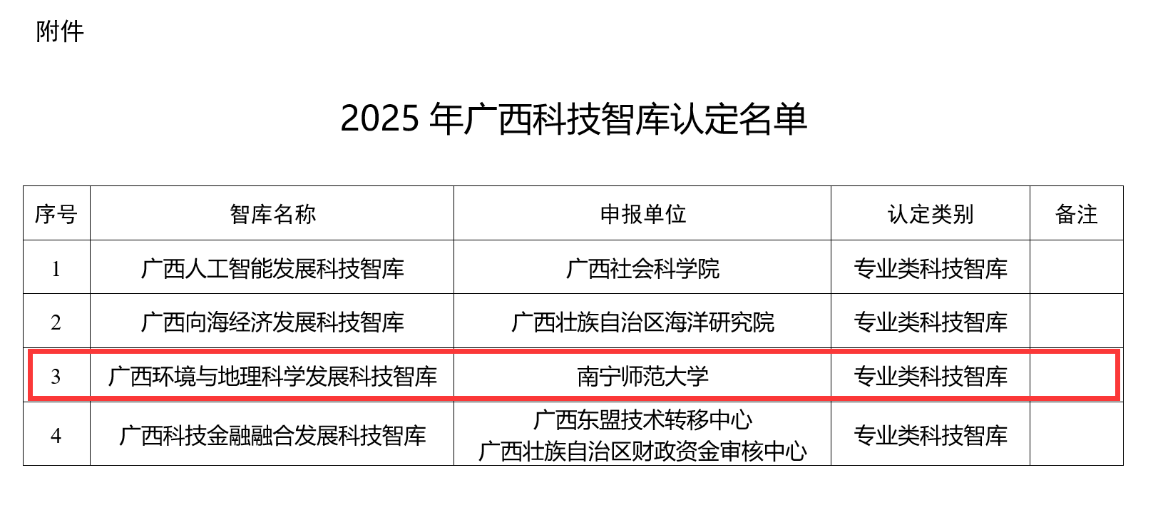 近日,广西壮族自治区科学技术厅发布《关于公布2025年广西科技智库认定名单的通知》,我校申报的“广西环境与地理科学发展科技智库”凭借扎实的科研基础、专业的研究团队和精准的决策咨询能力,成功入选认定名单。这标志着我校在服务广西科技创新重大决策领域迈出了关键一步。