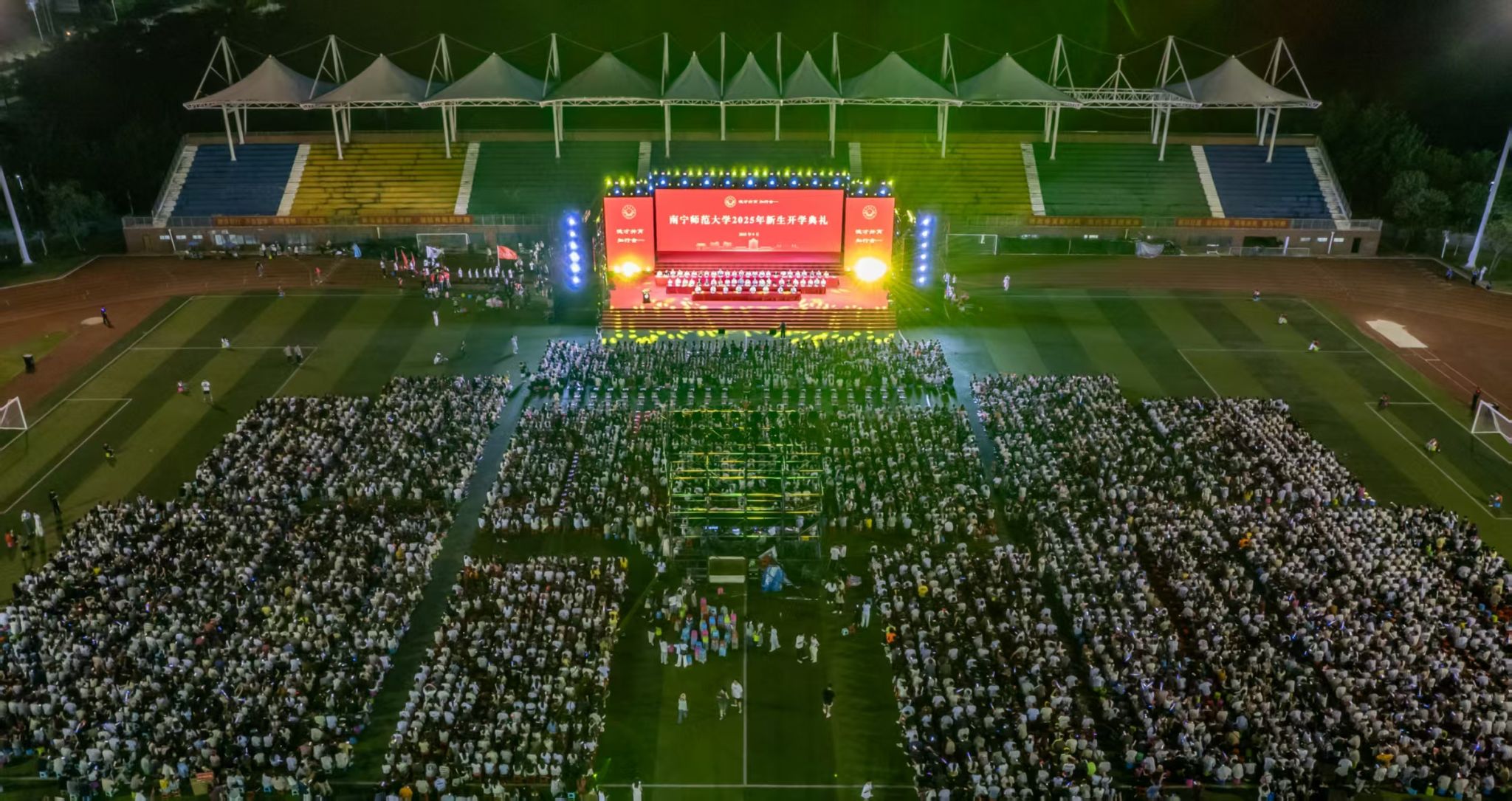 灯火璀璨映初心,青春扬帆正当时。最后,全体人员齐唱《歌唱祖国》,歌声振奋人心。怀揣梦想的2025级全体新生,带着对未来的憧憬,开启在南宁师范大学的崭新旅程。