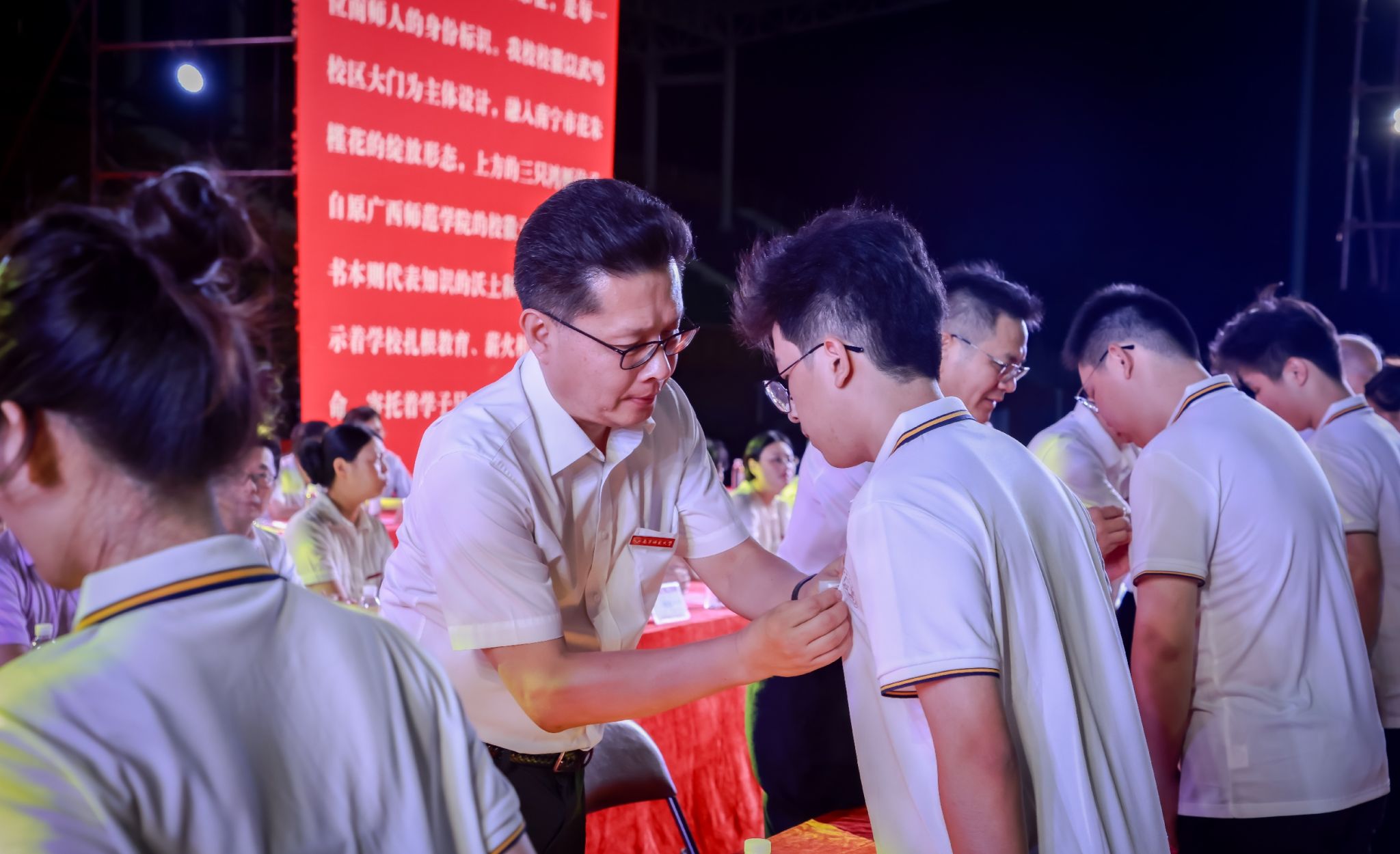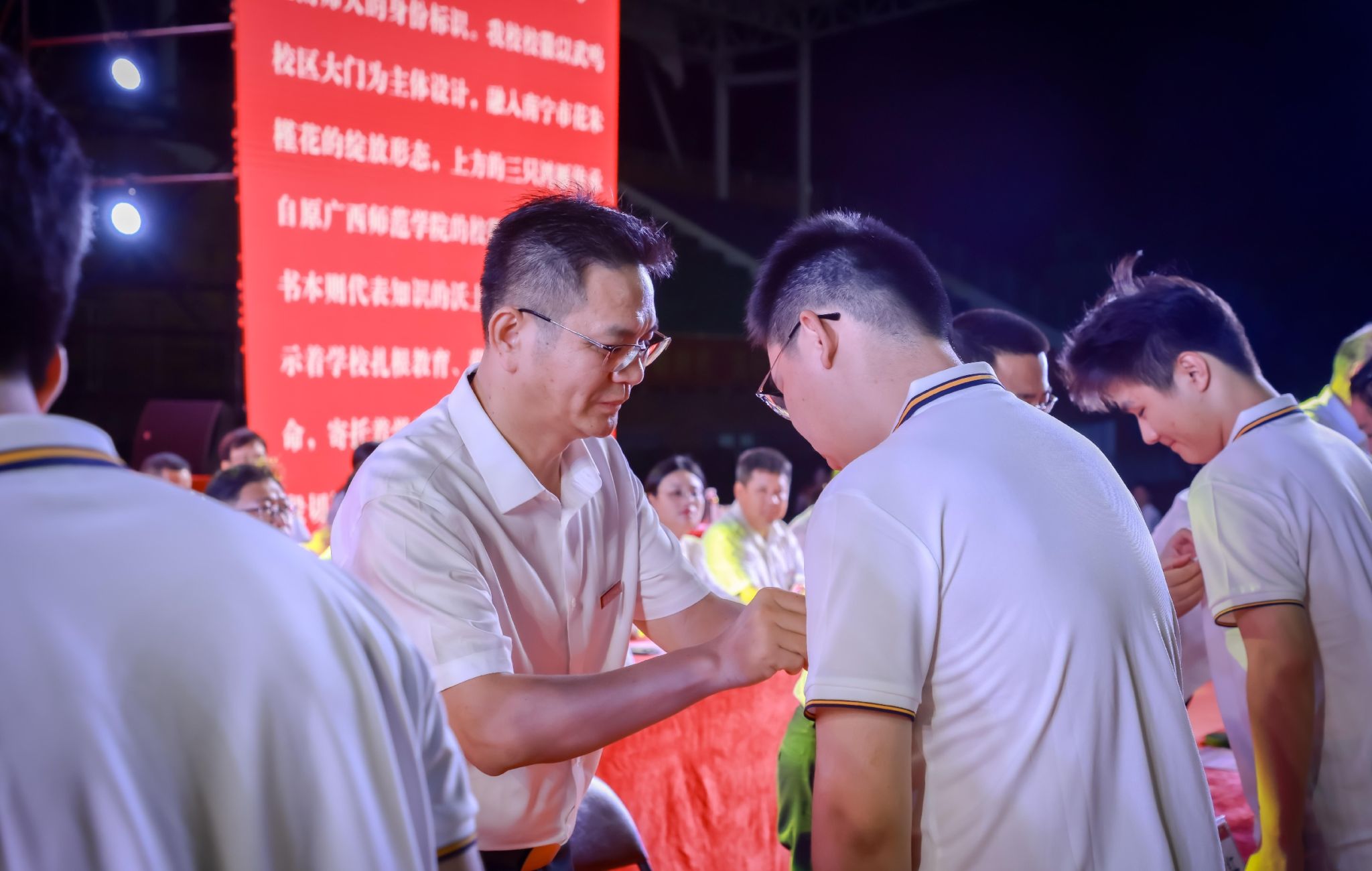 校长隆广庆为新生代表佩戴完美(中国)徽章