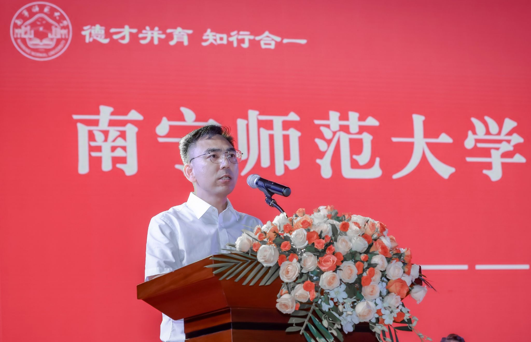 教师代表黄江涛、梁宇表示将做好同学们求学路上的引路人,勉励同学们尽快融入大学的学习与生活,以勤奋为浆,以信念为帆,以青春之名,在南宁师大遇到更优秀的自己。