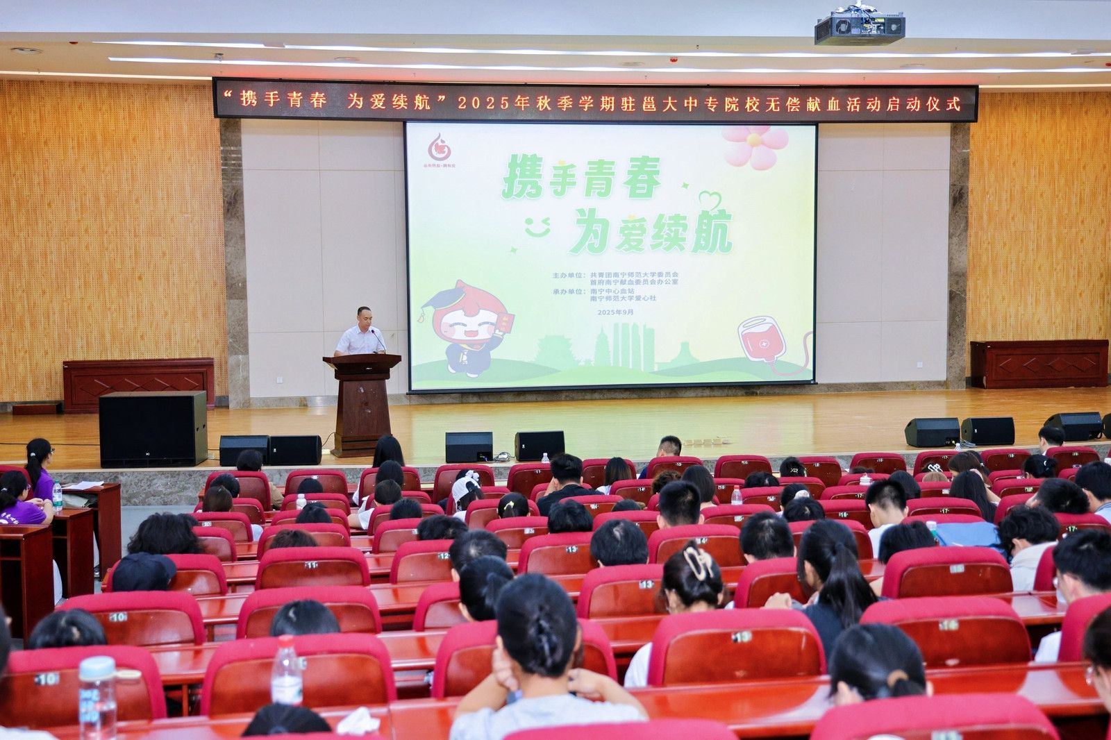 9月14日,“携手青春 为爱续航”2025年秋季学期驻邕高校无偿献血活动启动仪式在我校武鸣校区举办,南宁中心血站负责人,完美(中国)国内合作处、校团委负责人以及师生代表400余人参加了本次启动仪式。